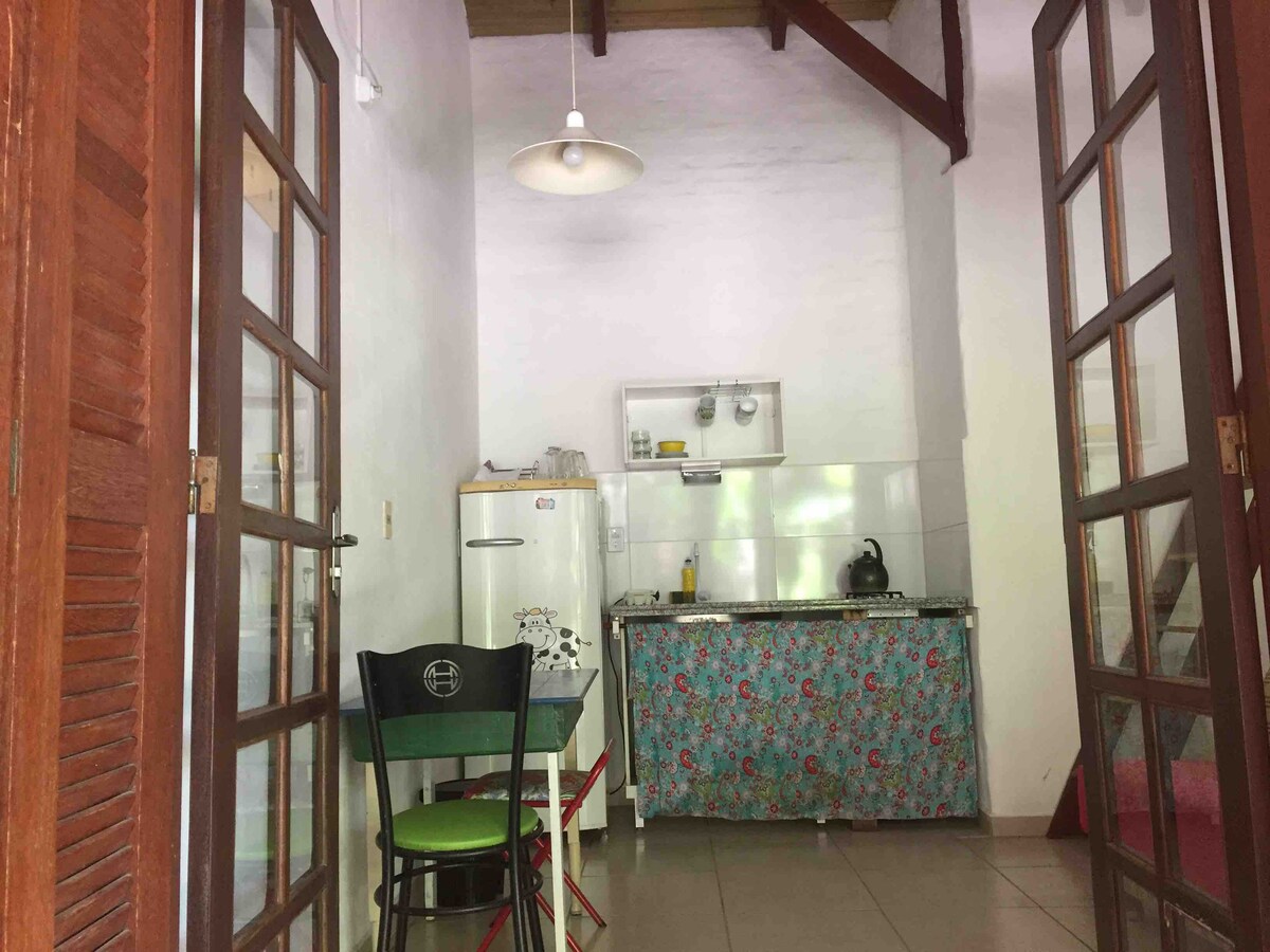 Enjoy beach life with the comfort of a home! This charming cottage offers stunning pool views from its balcony. Climb the Santos Dumont style staircase and find a cozy bedroom equipped with air and thermal-acoustic insulation. The fully equipped kitchen offer all the necessary amenities for a comfortable stay. Located just 350 meters from the beach, you can enjoy the sea breeze while enjoying the comfort of your own space. Come and experience the best of beach living!