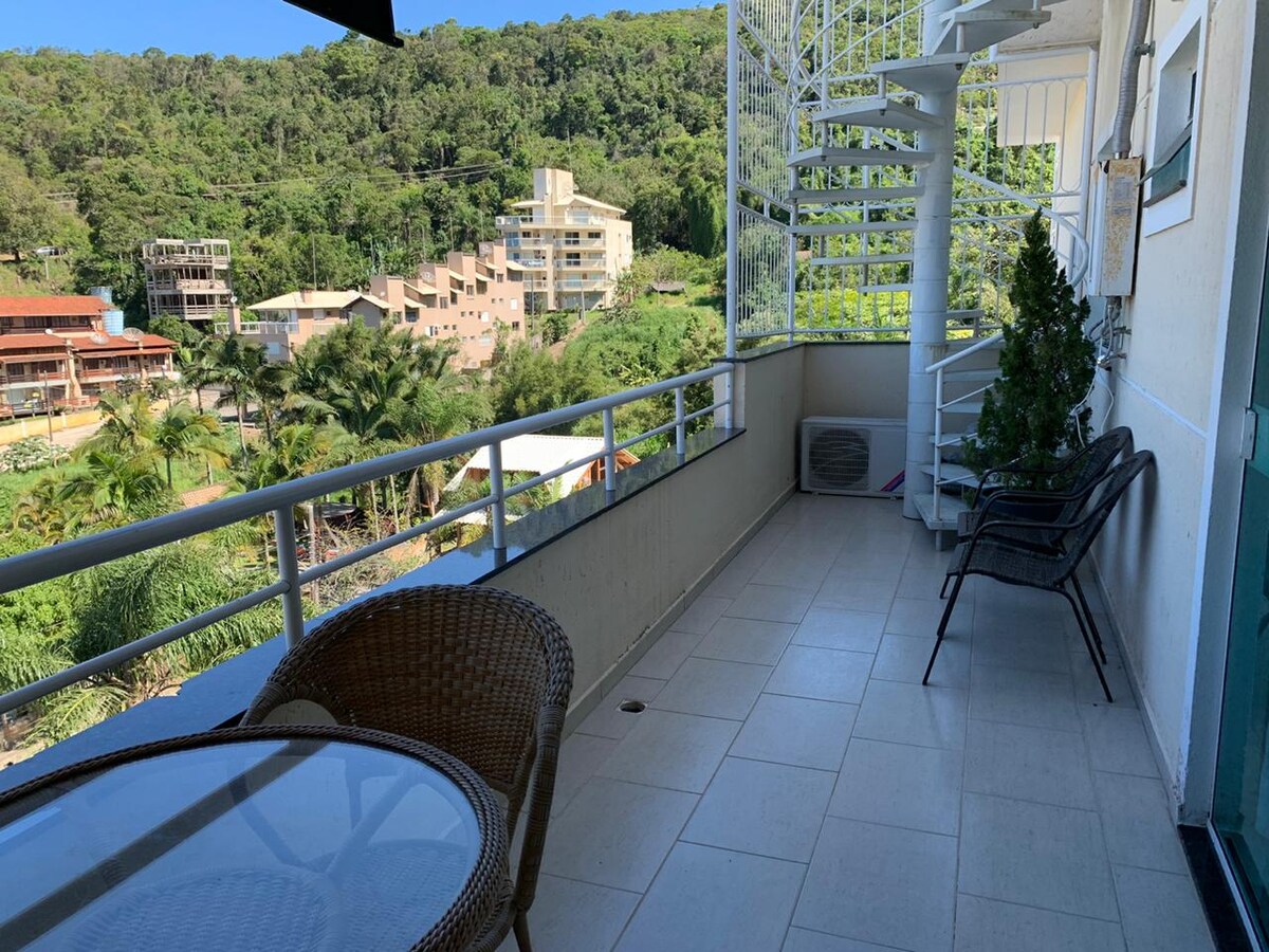 Apartment na may magandang tanawin ng Bombinhas, Bombas at Porto Belo. 1 silid - tulugan na Apt (double - queen size bed), kumpletong kusina, banyo, sala at balkonahe w/duyan. Moderno, malinis na dekorasyon, air - conditioning at LED TV. Ang property ay may patyo, swimming pool, mga barbecue at may 1 parking space (shared). 5 minutong lakad kami papunta sa mga beach: Lagoinha, Sepultura e Retiro dos Padres, tahimik at ligtas na lugar, 15 minutong lakad papunta sa downtown Bombinhas. Access sa bubong sa pamamagitan ng mga hagdan.