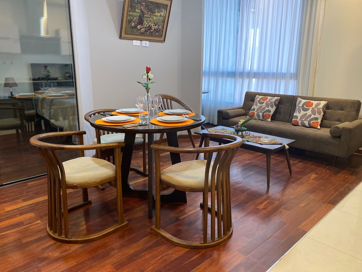 May sariling estilo sa loob ang natatanging tuluyan na ito, isang hiwalay na suite na may walk-in na aparador at kumpletong banyo. Malawak na sala na may kasamang silid-kainan para sa 4 na tao at kusinang kumpleto sa kagamitan kung saan puwede kang magluto ng gusto mo. serbisyo 100mbps na WiFi, sariling paradahan para sa iyong mobility, at crib kung may kasama kang Sanggol. Ang lugar ay may pinakamagagandang supermarket, bangko, restawran, cafe at nightclub I - book ang iyong pamamalagi