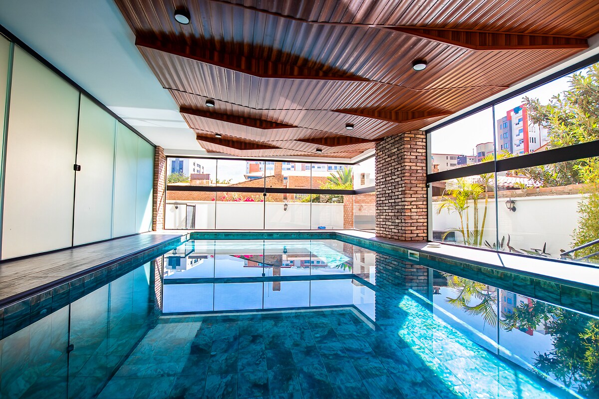 Masiyahan sa bagong naka - istilong condo na puno ng mga amenties na maaari mong ninanais. Malapit lang ang lahat sa magandang condo na ito. Nakasentro ito sa pinakamagandang lugar ng Cochabamba na nasa maigsing distansya ng pamimili, kainan, parke, pamilihan, at night life at marami pang iba.