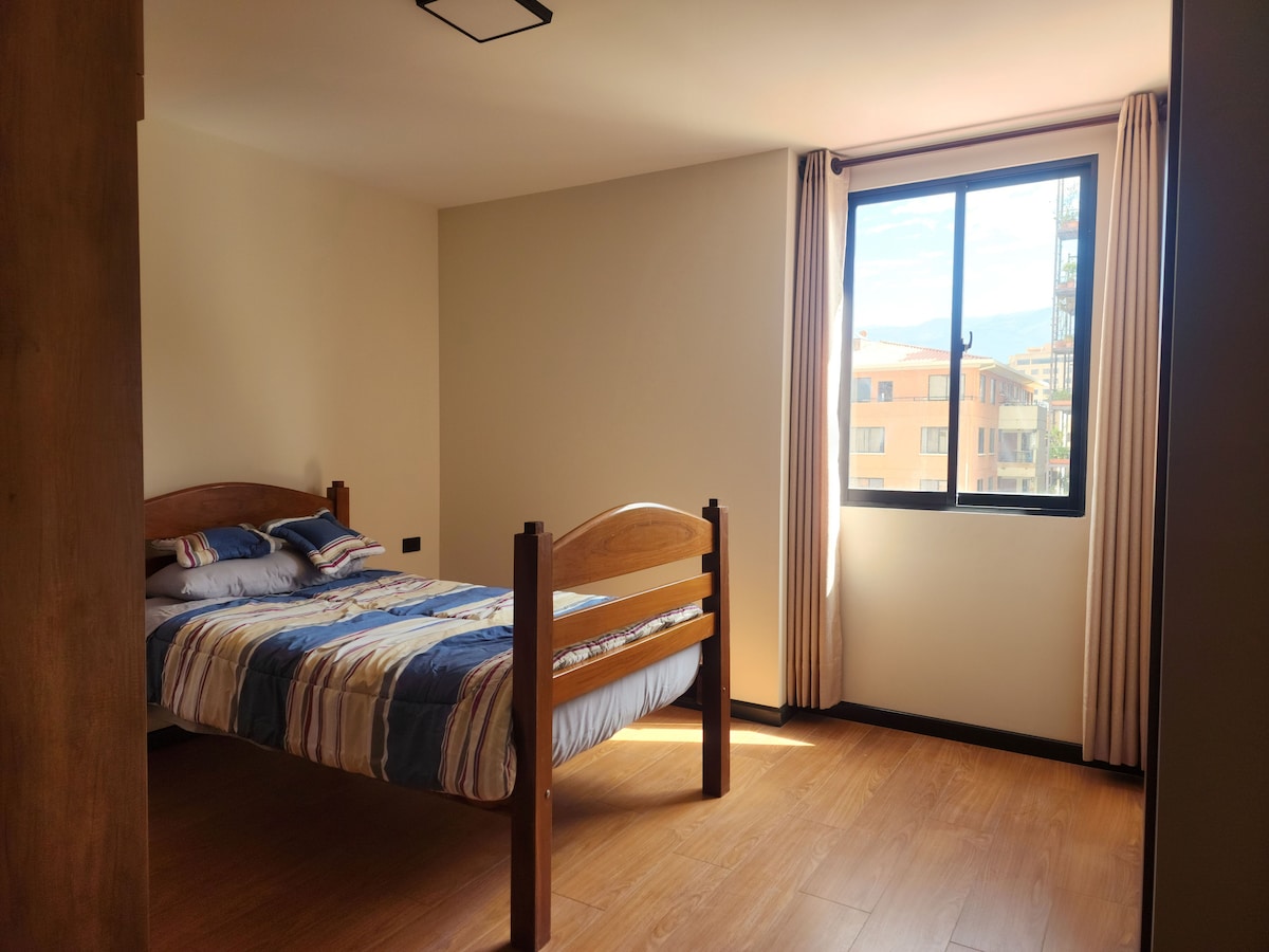 Masiyahan sa komportableng pamamalagi sa isang maganda, maluwag at marangyang apartment, kung saan mamumuhay ka ng hindi malilimutang karanasan na magpaparamdam sa iyo na komportable ka. Matatagpuan sa tabi ng Parque Excombatientes, isang tahimik at estratehikong lugar na nagbibigay - daan sa iyo upang maabot kaagad ang anumang punto ng lungsod. Mayroon itong dalawang silid - tulugan (isa sa Suite) na may TV, maluwang at kumpletong kusina, magandang sala na may mga detalye na nakakaengganyo sa tanawin. Magpareserba ngayon, naghihintay ang Cochabamba!