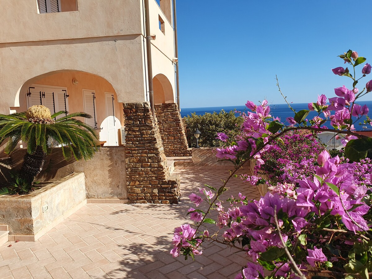 Nuovo appartamento con vista mare panoramica mozzafiato da ogni stanza; spazioso ed elegante arredato con gusto, completo di tutti gli accessori per assicurare un confortevole e rilassante soggiorno. È costituito da : 1 sala pranzo / soggiorno ed angolo cottura in unico ma spazioso ambiente; una camera matrimoniale, una cameretta con divano letto alla francese, un bagno doccia. E' dotato di microonde, lavatrice, aria condizionata, Wi-Fi gratuito.