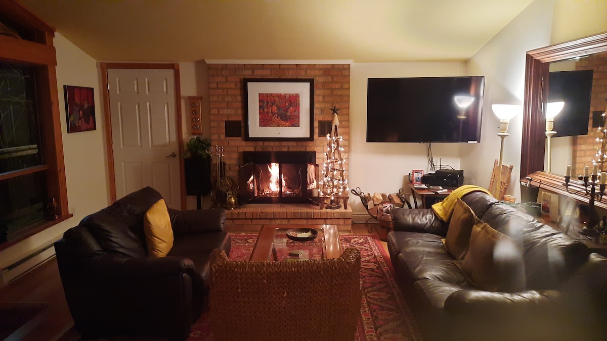 Relax in this truly Insta-worthy country house. Art meets nature with 70s boho vibes. Sleeps 8. Fully equipped kitchen, large open plan w/ 2 living rooms & wood fireplace (wood complimentary). Surround yourself with nature in comfort. Screened outdoor living/dining room with outdoor heaters. Large yard with BBQ & firepit. Wifi (Fibre Op), Smart TVs (w/Netflix, etc), board games, etc Less than 1 min drive to Mt. Cascades ski hill & water park. 10 min drive to Gatineau river public park.