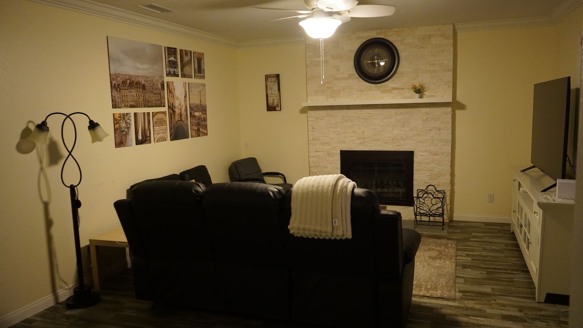 Welcome to this newly remodeled home in a nice neighborhood with quick freeway access perfect for traveling professionals or family’s. This 3/bed 2/bath house features 1 California king bed and 2 queen beds. All 3 bedrooms have ceiling fans and include pull down blackout blinds. Enjoy a private backyard. Make yourself at home in 2 separate living rooms which each have a fireplace and chow down on your favorite meals in a fully stocked kitchen. We even have a sunroom that can double as an office.
