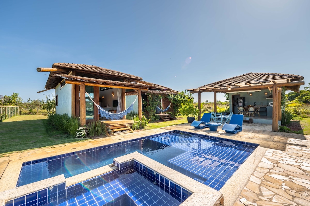 CASA MANGABA AZUL Mayroon kaming pribadong lote na 1,125m², may pader, damuhan, puno, may water treatment, pribadong pool at gourmet space, na matatagpuan sa subdivision ng Vila Angélica na 1 km mula sa sentro ng Barra Grande kung saan matatagpuan ang Vila de Barra Grande at ang Pier, 1.5 km mula sa Ponta do Muta, 7 km mula sa Taipu de Fora, at 800 metro mula sa Bombaça Beach. Ito ay isang napaka‑komportable at tahimik na tuluyan para sa pamilya at mga kaibigan. May kumpletong kagamitan ang bahay, may AC at kusinang may mga kubyertos.