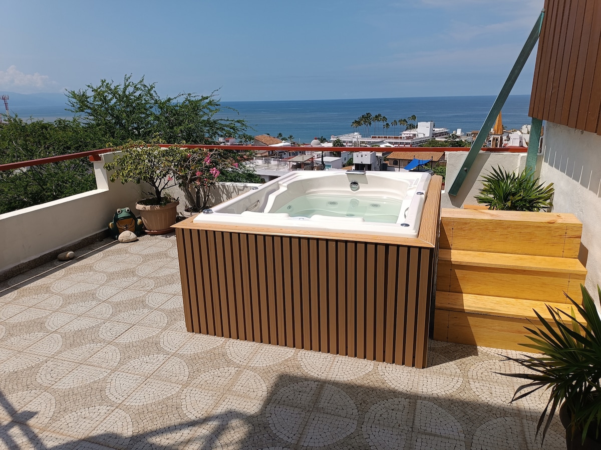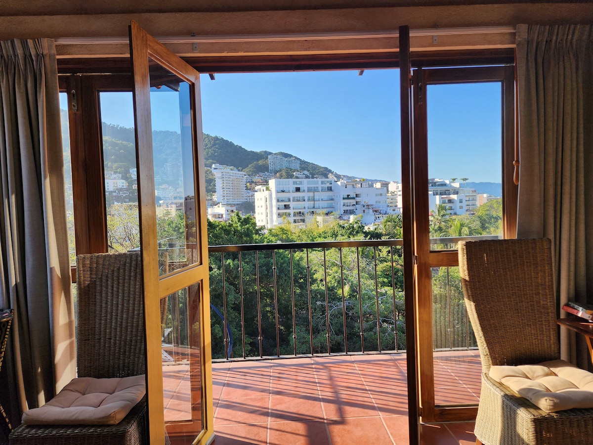 Mula sa greatroom at malaking deck mayroon kang 360 degree na tanawin ng mga bundok, Zona Romantica at Pacific Ocean. Matatagpuan kami sa tabi ng bahay ng Elizabeth Taylors, ngunit direkta sa River Cuale. Tahimik ang kapitbahayan. 4 na minutong lakad lang mula sa parke ng ilog papunta sa mga beach, Malecon, at mga tindahan. Matulog sa gabi na nakabukas ang lahat ng pinto at masiyahan sa tunog ng ilog at simoy ng hangin na bumababa sa lambak. Maghapunan sa kusina sa labas at panoorin ang paglubog ng araw sa ibabaw ng Marieta Islands.