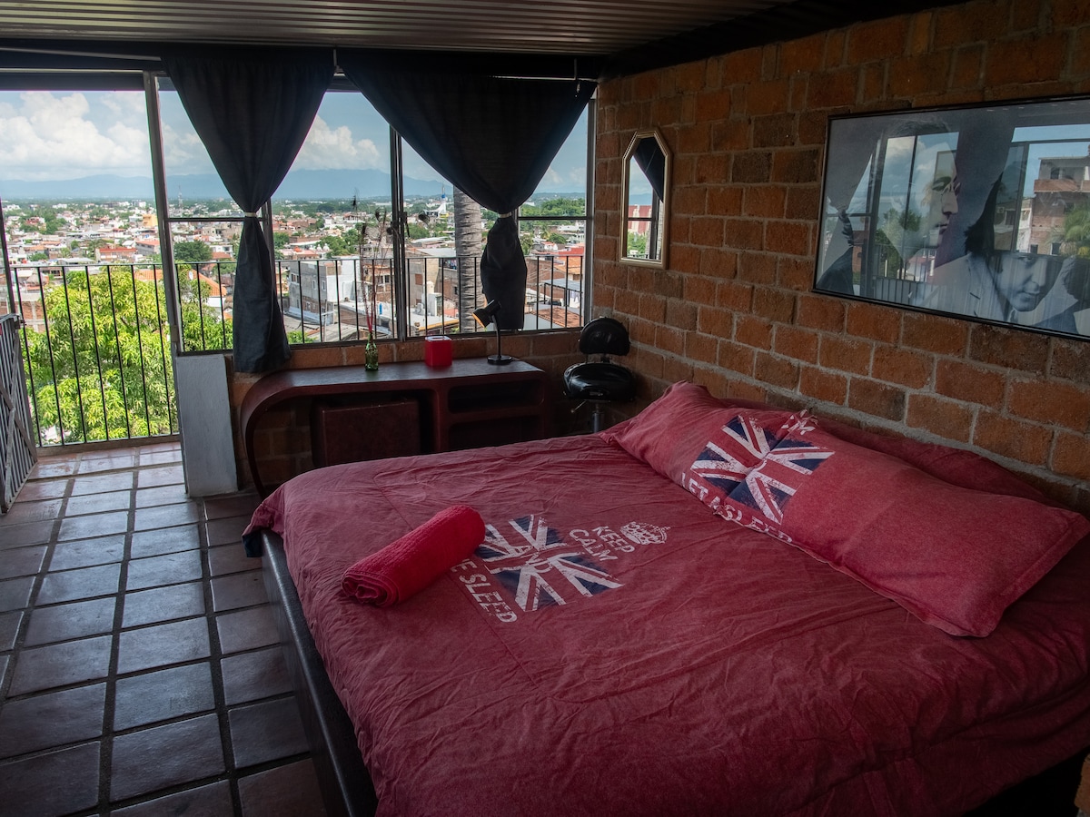 Matatagpuan sa ikaapat na antas na may king - sized na higaan at kalahating banyo. Ang kuwartong ito ay may mga bintanang nakaharap sa hilaga, kanluran, at timog at isang nakamamanghang tanawin ng Bay of Banderas at isang magandang liwanag na hangin. Access sa mga shower, kumpletong open - air na kusina at patyo sa rooftop at sun deck sa isang palapag sa ibaba.