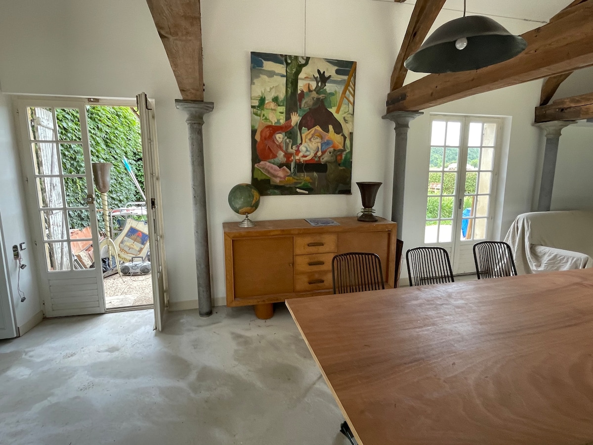 loft apartment na 100 m2, ganap na pribadong pag - aari. hindi pangkaraniwan at maluwang. perpekto ang loft para sa pagho - host ng mag - asawa. nilagyan ng kusina at hi - fi na sistema ng pinakabagong henerasyon, na may fiber internet ang perpektong lugar para magpahinga o maging isang remote na lugar ng trabaho. may kasamang mga tuwalya at sapin. Ang tuluyan ay isang walang pinto na duplex na may silid - tulugan at banyo sa itaas na mapupuntahan ng hagdan na walang mga rehas. masiyahan sa malaking lugar na 15 minuto lang ang layo mula sa Bordeaux