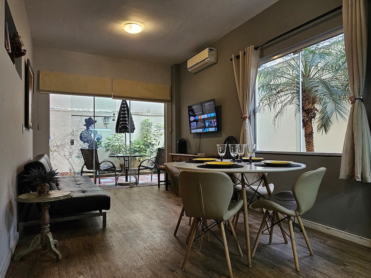 Matatagpuan ang apartment sa sentro ng lungsod, na matatagpuan sa ikawalong palapag. May 01 double bedroom, banyo, balkonahe at pinagsamang sala na may kusina (lahat ay may kumpletong kagamitan). Kumportableng tumatanggap ito ng hanggang limang tao ( Isang double bed na 1.58 cmX 2.20cm at dalawa pang support mattress ang isang pares ng isa pang single). Drawer na may kapasidad para sa 01 sasakyan na maximum na 4.35 m ng pagsunod. - Queen bed. - Mga gas ng suporta. - Antonio. - TV Smart . - Wi - Fi. - Linya ng seguridad. - Washing machine.