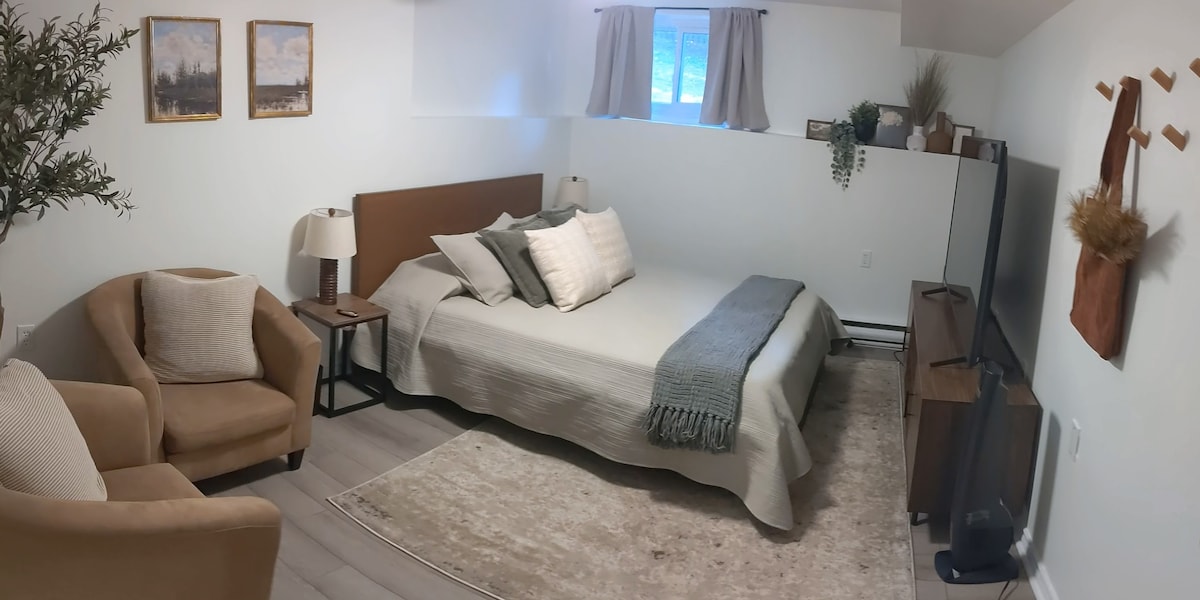 Maligayang pagdating sa aming bagong 1 - bedroom basement unit, kung saan nagtatagpo ang kaginhawaan at kalinisan. Tangkilikin ang maluwag na sala na perpekto para sa pagpapahinga, at komportable at kusinang kumpleto sa kagamitan para maghanda ng mga kaaya - ayang pagkain. Isinasaalang - alang ang bawat detalye para matiyak ang komportable at kasiya - siyang pamamalagi. May mga modernong amenidad at bagong ambiance, magiging komportable ka. Tuklasin ang mga kalapit na atraksyon at bumalik sa iyong pribadong santuwaryo para sa isang mapayapang bakasyunan. Halina 't damhin ang kagandahan ng ating tuluyan!