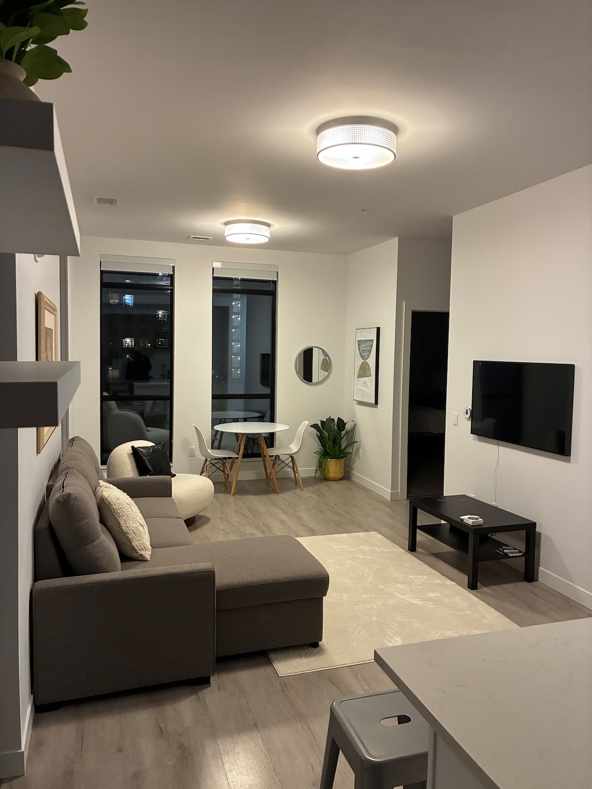 Modern and Sophisticated 1+1 apartment in the heart of Kitchener Downtown and Uptown Waterloo. It features modern furniture, a fully equipped kitchen, and a balcony with stunning sunset views. Enjoy exclusive amenities like a bowling alley, spa, pool table, and hydro swimming pool. The apartment comfortably sleeps 3 with two cozy beds. Located steps from top bars and restaurants, this apartment offers a blend of luxury and convenience. Perfect for business or leisure stays.