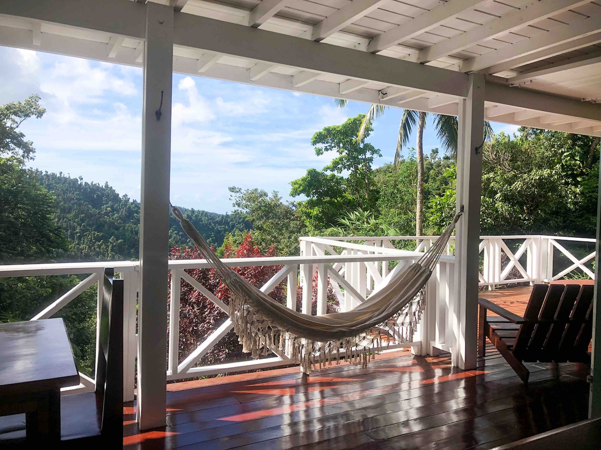 Isang rainforest perch kung saan matatanaw ang botanikal na paraiso at papunta sa Dagat Caribbean. Isang liblib na bakasyunan na may organikong lumago na ani at isang artisan na essential oil distillery. Makaranas ng kaakit - akit na araw at mga buwan, pagkakaiba - iba ng ibon at bulaklak, mga lilly pond at kambing. Ang solar powered cabin ay may mga kaginhawaan ng isang ensuite hot shower at high speed internet. May isang full sized bed at isang single bed. Maluwag ang verandah na may mga lounging chair at duyan. Buong kusina at pavilion ng kainan