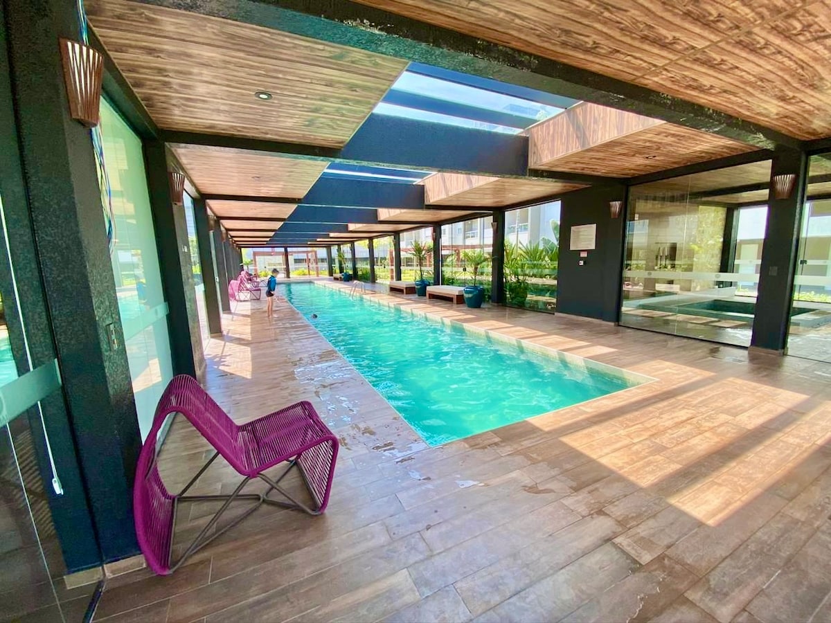 Narito ang iyong perpektong bakasyunan — isang eleganteng apartment sa isang high - end na condo na may estruktura ng resort kabilang ang swimming pool, spa, gym at 24 na oras na seguridad. Kaginhawaan, pagiging eksklusibo at kalikasan nang magkakasundo para sa mga taong nagkakahalaga ng katahimikan nang hindi isinusuko ang pagiging sopistikado. Pinupuri ng aming mga bisita ang pribilehiyo na lokasyon at pangangalaga sa bawat detalye ng tuluyan. Garte ngayon ang iyong hindi malilimutang pamamalagi sa paraisong ito. Naghihintay sa iyo ang beach sa kabila ng kalye!