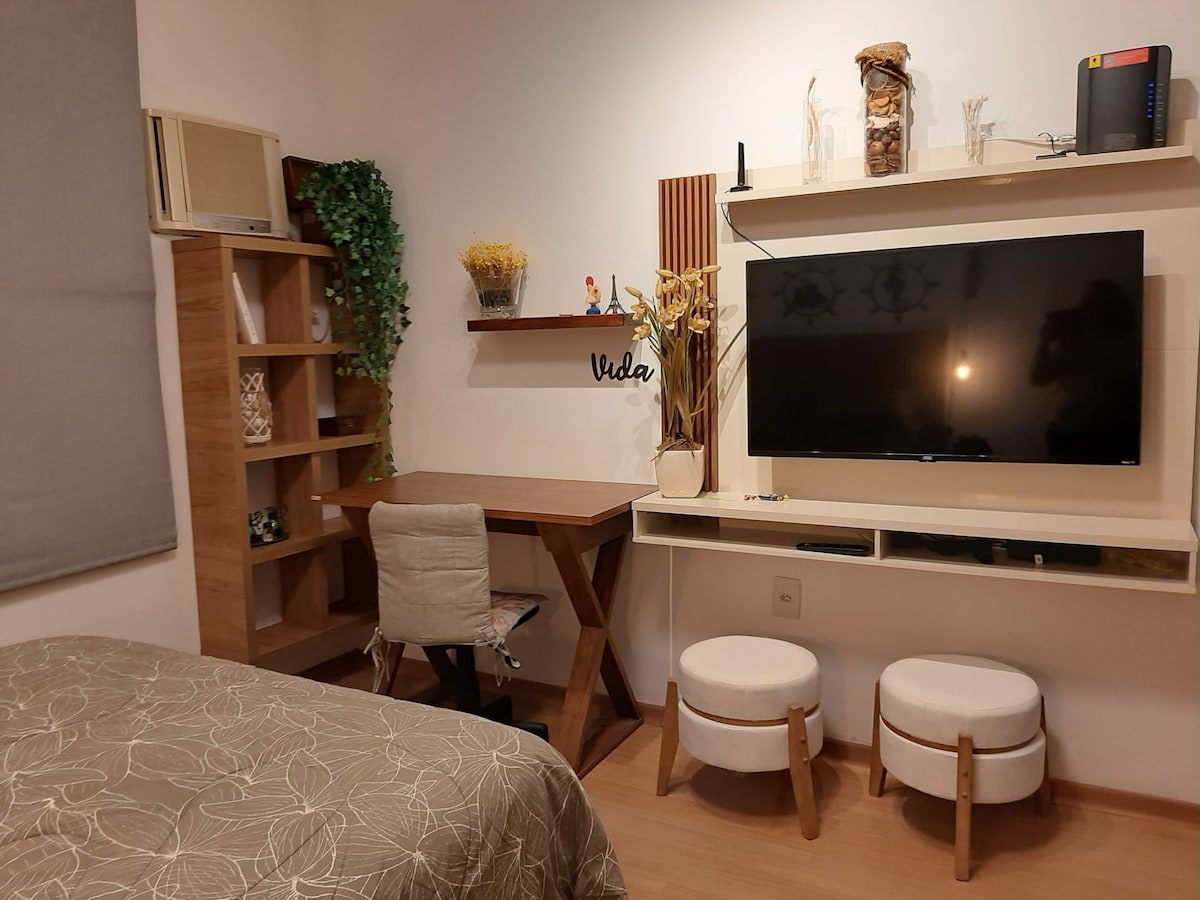 1 Dorm, Kuwarto, Kusina at Banyo, sa tabi ng lahat ng komersyo , 3 minutong lakad papunta sa beach, Wifi Vivo Fibra 200 MB. Hindi kami nagbibigay ng mga bed and bath linen. Ligtas na gusali, na may 24 na oras na concierge, mga camera at mga de - kuryenteng gate. Central Filter (na - filter na tubig sa lahat ng gripo at shower). 1 paradahan (paradahan sa available na lugar) . Iwanan ang iyong kotse sa garahe at gawin ang lahat habang naglalakad.