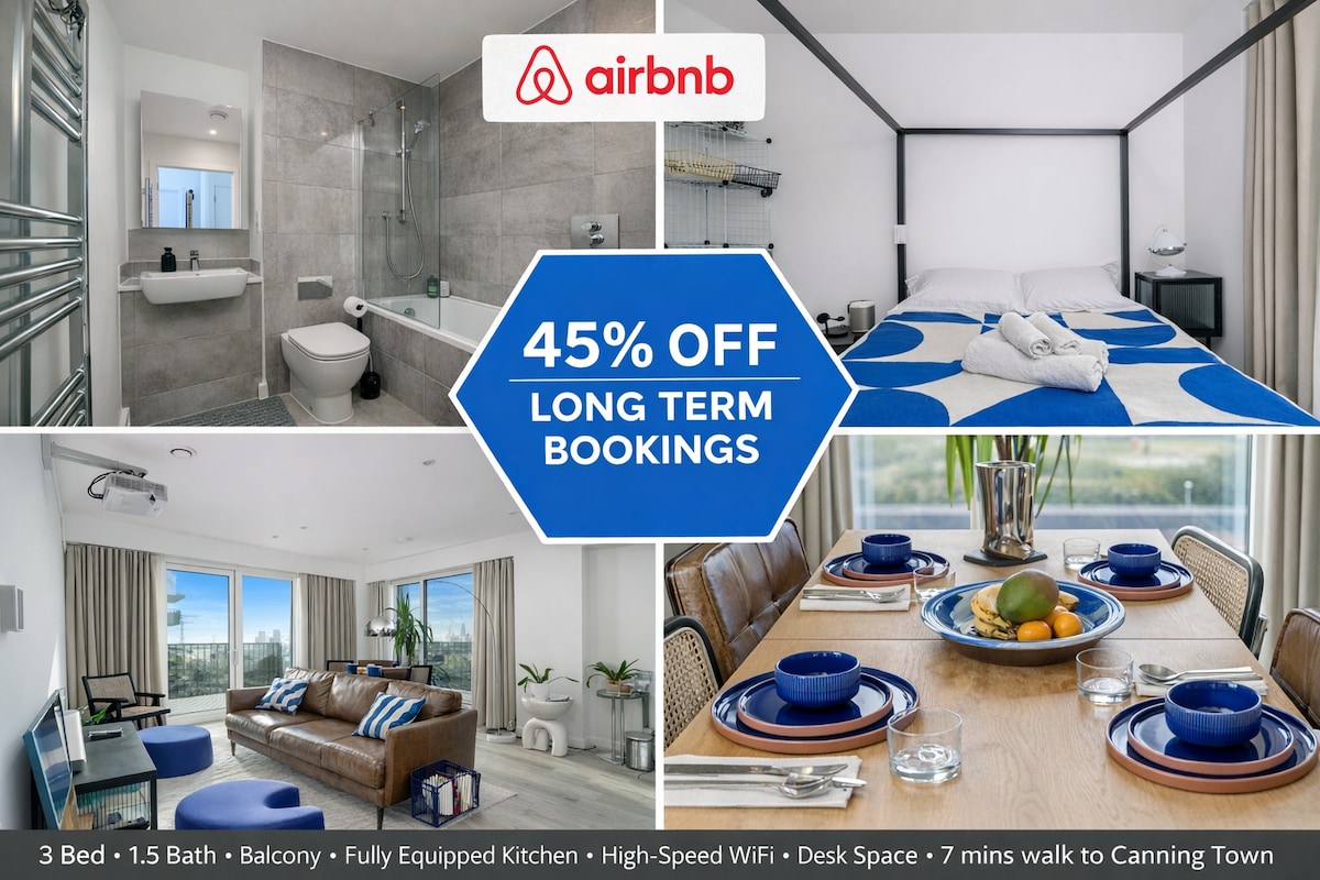 Appartamento con 2 camere da letto e 2 bagni, situato a due passi da Canary Wharf, O2 Arena, ExCeL e alle linee Jubilee e Elizabeth line. Cosa amerai: -Balcone soleggiato per il caffè del mattino -Cucina attrezzata e Wi-Fi veloce, ideale per viaggi di lavoro -Supporto Superhost con risposte in meno di un’ora -Self check-in 24/7. Perfetto per concerti, soggiorni business o per esplorare le London Docklands Pronto a prenotare? Clicca su “Prenota” e rendi questo rifugio il tuo prossimo soggiorno!