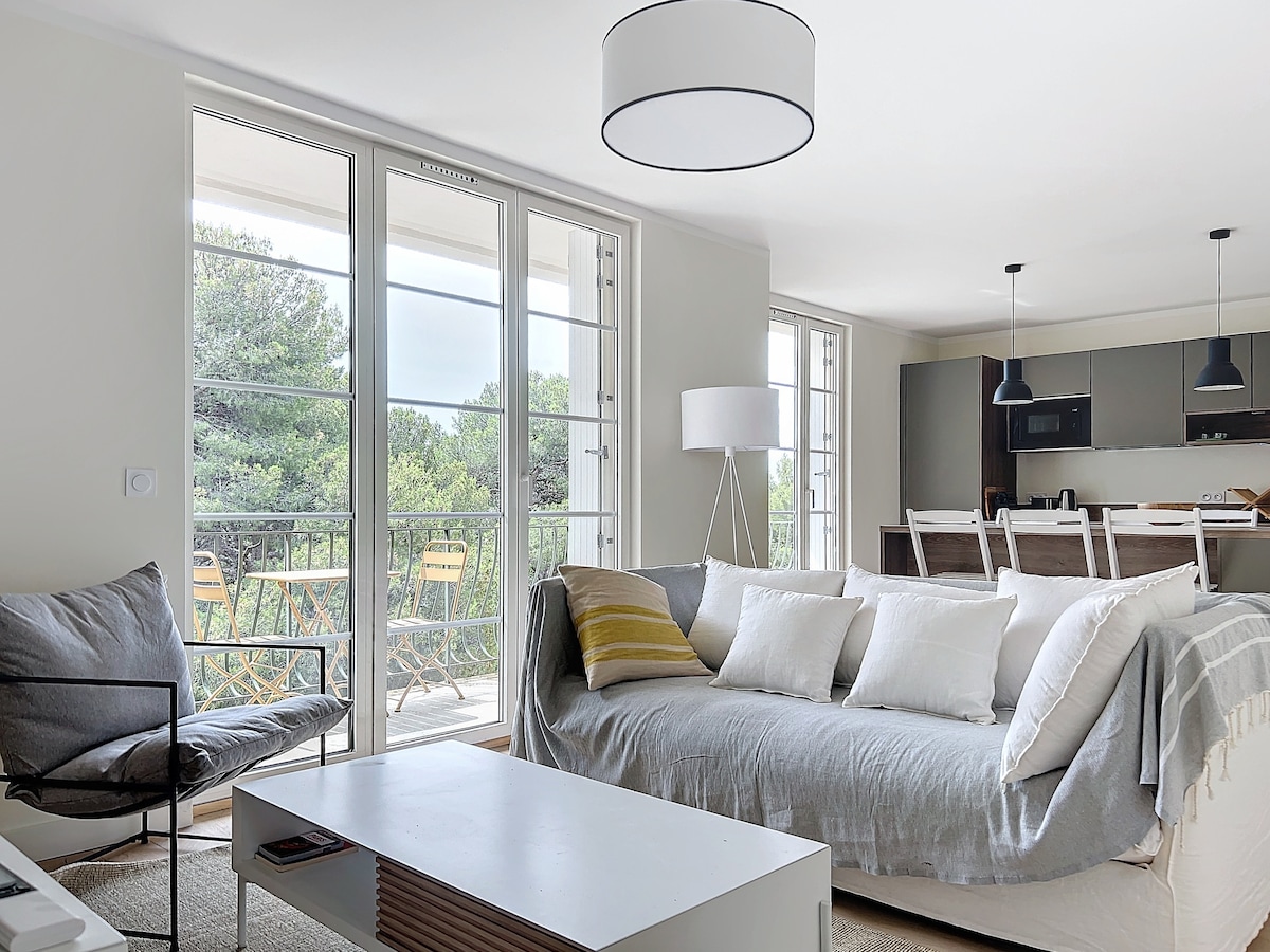 Bago at modernong apartment na tumatanggap ng hanggang 4 na tao. - Ika -2 palapag na may elevator - Bagong tirahan na matatagpuan sa isang napaka - tahimik at residensyal na lugar - Malaking terrace na may mga walang harang na tanawin ng Cap Brun at Mont Faron - Daanan ng bisikleta sa tabi mismo at malapit sa mga beach. - May isang silid - tulugan, sala, bukas at kumpletong kagamitan sa kusina, banyo at malaking terrace. - Pribado at nakatalagang paradahan (para sa karagdagang sasakyan, libreng pampublikong paradahan sa harap)