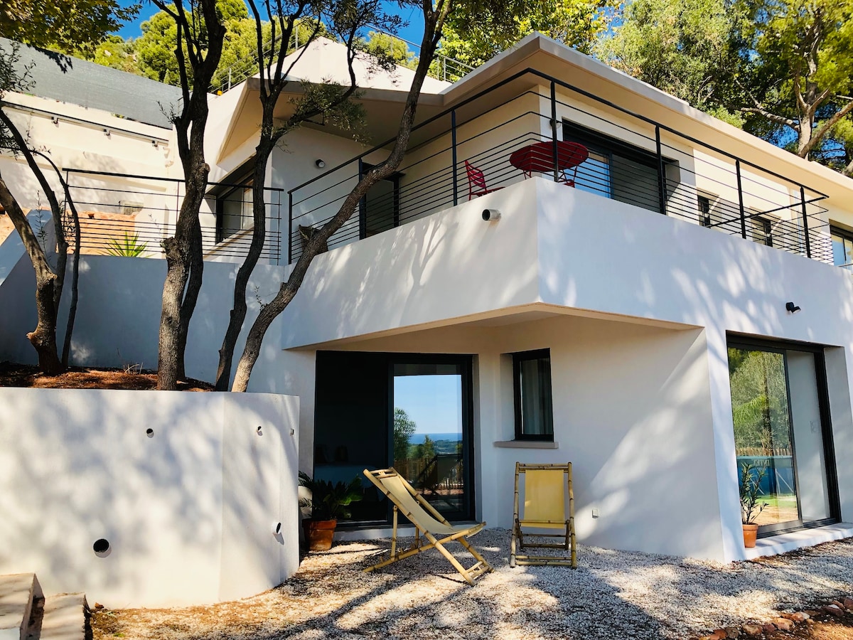 100m2 architects 'terraced house villa, na napapalibutan ng mga malalaking terrace na may mga nakamamanghang tanawin ng karagatan at lungsod, na napapalibutan ng mga pine tree at puno ng oliba. 10 min. mula sa Toulon town center at sa mga beach. Perpekto ang lugar na ito para sa nakakarelaks na pamamalagi sa timog, na tamang - tama para tuklasin ang pinakamagagandang atraksyon sa rehiyon. Inaasahan ka ni Stephanie at ng iyong pamilya na tanggapin ka roon at ibigay sa iyo ang lahat ng nakatagong hiyas ng rehiyon.