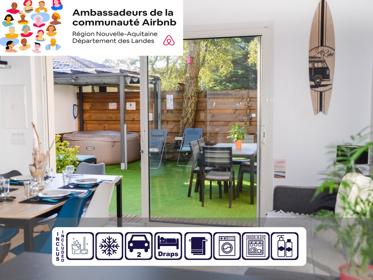 Loft style house in nice & quiet neighborhood with patio under the pines. Ideally located b/w the port and Capbreton's beach, close to grocery store, bakery and beach bus. Big living room with american kitchen. 2 bedrooms and bathroom upstairs. Private terrace with dining table and BBQ IMPORTANT: Arrivals and departures will be autonomous with secured key box.
