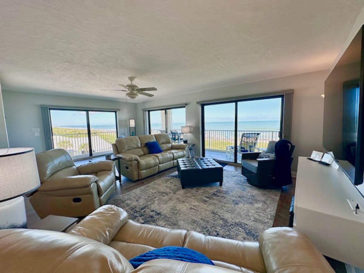 Isang balkonahe na pambalot na nag - aalok ng pinakamagagandang tanawin mula sa sala. Nagbubukas ang master bedroom hanggang sa balkonahe. Available ang tatlong flat screen TV at WiFi. Ang mga upuan sa beach ay ibinibigay para sa iyong kasiyahan. Panoorin ang mga rocket launch at cruise ship mula sa iyong balkonahe. Ang Sandcastles ay isang mahusay na pinapanatili na complex na may pinainit na pool, hot tub, community room, tennis court, at marami pang iba! Halika masiyahan sa iyong slice ng paraiso... ang buhangin sa pagitan ng iyong mga daliri sa paa at ang mga cool na tubig ng Karagatang Atlantiko!
