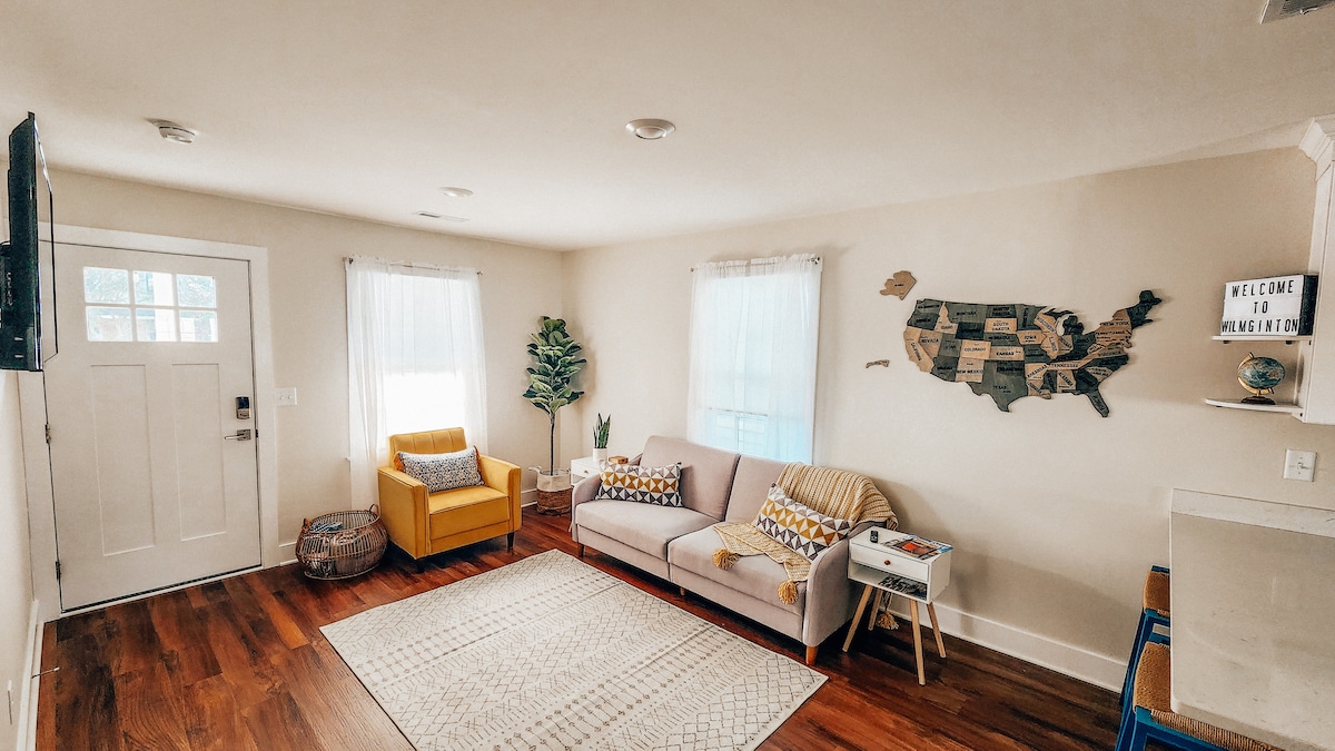 A Chic and Seaside-esque Getaway! This home was newly redone (w/love) in a quaint neighborhood near downtown and a short drive to the beach. 3 brs w/ an open floor plan, great for gathering & entertaining! A private backyard with a grill & firepit. Large front porch with cozy seating. Spacious couch for relaxing; open area for kids upstairs. 1 mile from the heart of downtown and Riverwalk. Explore historic downtown Wilm shopping, coffee, restaurants, antiquing or pack up for a day at the beach!