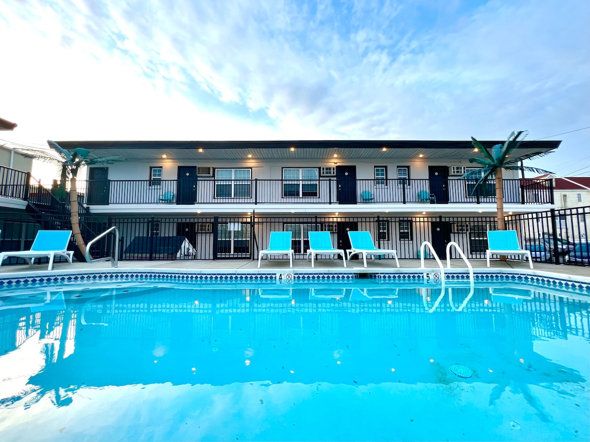 GRAND RE - OPENING NA MAY MGA BAGONG RENOVATIONS NA DARATING SA MEMORIAL DAY WEEKEND NA ITO! Kagila - gilalas sa lahat ng bagay, ang Brooklyn Beach Club ay ang tunay na destinasyon ng bakasyon na idinisenyo upang mapaunlakan ang mga bisita sa lahat ng edad. Maging una sa karanasan sa kabuuang pagbabago ng isang dating hindi magkatugma na motel sa isang nakakarelaks na retreat ilang minuto lamang mula sa beach. Sa pamamagitan ng isang kumpletong facelift sa loob at labas, tangkilikin ang isang maliit na R&R sa isang ganap na renovated room na may isang floorplan likened sa na ng isang studio apartment kaysa sa isang tradisyonal na espasyo ng hotel. Kasama sa mga renderings ang nagpapakita ng aming masinop na bagong hitsura na nakatakda sa pasinaya sa oras para sa Memorial Day Weekend 2022. Ang bawat isa sa aming 14 na mid - century style suite ay madiskarteng idinisenyo upang mapakinabangan ang espasyo nang hindi isinasakripisyo ang estilo. Kumpleto sa maliit na kusina na ipinagmamalaki ang isang full - sized na refrigerator, kalan, microwave at Keurig coffee maker kasama ang hapunan - at lutuan na bumibiyahe nang madali kasama ang lahat ng kaginhawaan ng tuluyan. Nagbibigay ang kitchen set ng dagdag na seating o eating space na perpekto para sa pagho - host ng home cooked meal na inihanda sa iyong pribadong kusina. Ang isang komportableng sleeper sectional ay nagbibigay - daan para sa dagdag na sleeping o relaxation accommodation. I - unpack ang iyong mga maleta sa isang maluwang na aparador o malaking aparador para gawing simple ang iyong pamamalagi dahil maaraw ito. Ang isang hanay ng mga malambot na sheet at maginhawang kubrekama sa isang queen bed kasama ang isang full - over - full bunk bed ay nagbibigay - daan para sa isang komportableng lugar upang ilagay ang iyong ulo kapag tapos na ang araw. Sa labas, magpasyang mag - lounge sa paligid ng in - ground pool o magbabad ng ilang sinag sa aming ikalawang palapag na terrace. Ang mga maliliwanag at magagaan na lounger, mga upuan sa gilid at mga komportableng couch ay nagbibigay ng pinakamainam na mga opsyon sa pag - upo sa buong pool at mga lugar ng patyo. Ang mga picnic table sa paligid ng likod ay gumagawa ng perpektong setting ng tanghalian pagkatapos ng mahabang araw sa ilalim ng araw. Ang paradahan on - site ay nagbibigay - daan para sa madaling pag - access sa iyong sasakyan para sa paglo - load at pagbaba ng mga layunin. Ang aming pampamilya ngunit masaya at masiglang pakiramdam ay naghihikayat sa isang destinasyon ng bakasyon na angkop para sa lahat. May gitnang kinalalagyan sa gitna ng Wildwood ilang bloke lamang mula sa beach at boardwalk, isawsaw ang iyong sarili sa pagkilos ng isla kasama ang ilan sa mga pinakasikat na bar at restaurant sa paligid. Magpakasawa sa isang nakakapreskong almusal o brunch sa Marvis Diner o masiyahan ang iyong matamis na ngipin sa Duffer 's Restaurant at Old Fashion Ice Cream. Ilang hakbang lang ang layo ng hapunan at mga inumin sa mga lokal na pangunahing bilihin kabilang ang Dogtooth Bar and Grill, MudHen Brewing Company at Poppi 's Pizza para pangalanan ang ilan. Bisitahin ang sikat na Wildwood sign na matatagpuan sa isang bloke sa boardwalk at kumuha ng litrato ng pamilya na pumupukaw sa mga alaala ng isang bakasyon na hindi mo malilimutan sa lalong madaling panahon. Hindi na kami makapaghintay na makita ka. Email: brooklynbeachclub@gmail.com MGA ALITUNTUNIN AT KARAGDAGAN SA TULUYAN: Bawal uminom ng kulang sa edad. Bawal manigarilyo. Maaaring mag - apply ng mga dagdag na bayarin sa paglilinis. Panatilihin ang ingay sa isang minimum pagkatapos ng 11:00pm (walang malakas na musika o noises). Hugasan ang iyong mga pinggan pagkatapos gamitin ang mga ito. ***Habang may mga kobre - kama para sa iyong kaginhawaan at kaginhawaan, hindi ibinibigay ang mga tuwalya. Pakitiyak na dalhin ang iyong sarili.***