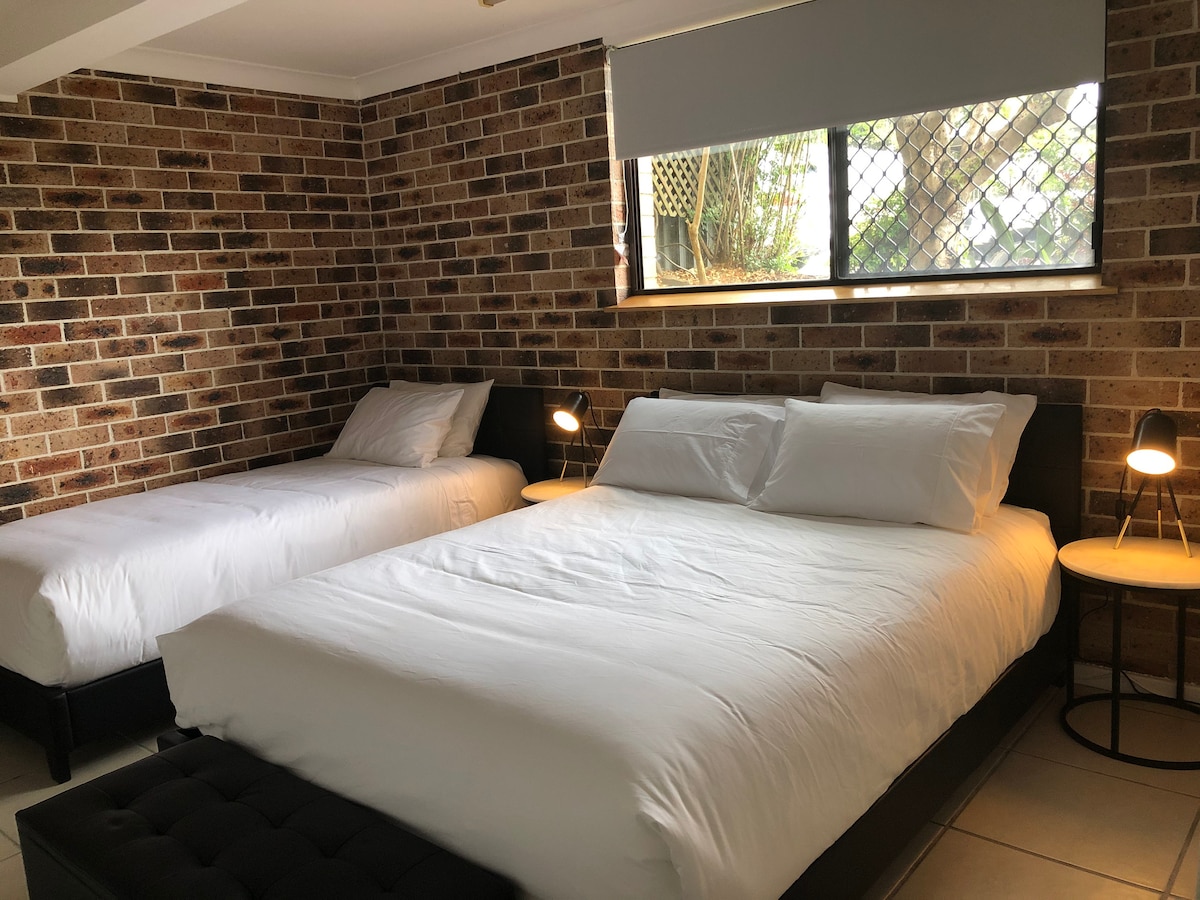 Matatagpuan ang JH Studio sa gitna ng Newcastle, 5 minutong biyahe lang mula sa JH Hospital, Blackbutt Reserve, at mga parke. Ang modernong ito at maluwang na one bedroom studio ay nasa ibaba ng pribadong bahagi sa likod ng aming tirahan, na may hiwalay na pasukan at tahimik na paradahan sa kalye. Nagtatampok ito ng komportableng king size na higaan, bagong ayos na banyo at labahan, sariling kusina, sala at silid-kainan, snooker table at mga estilong kagamitan. Mag-enjoy sa libreng Wi‑Fi at continental breakfast basket na kasama sa pamamalagi mo.
