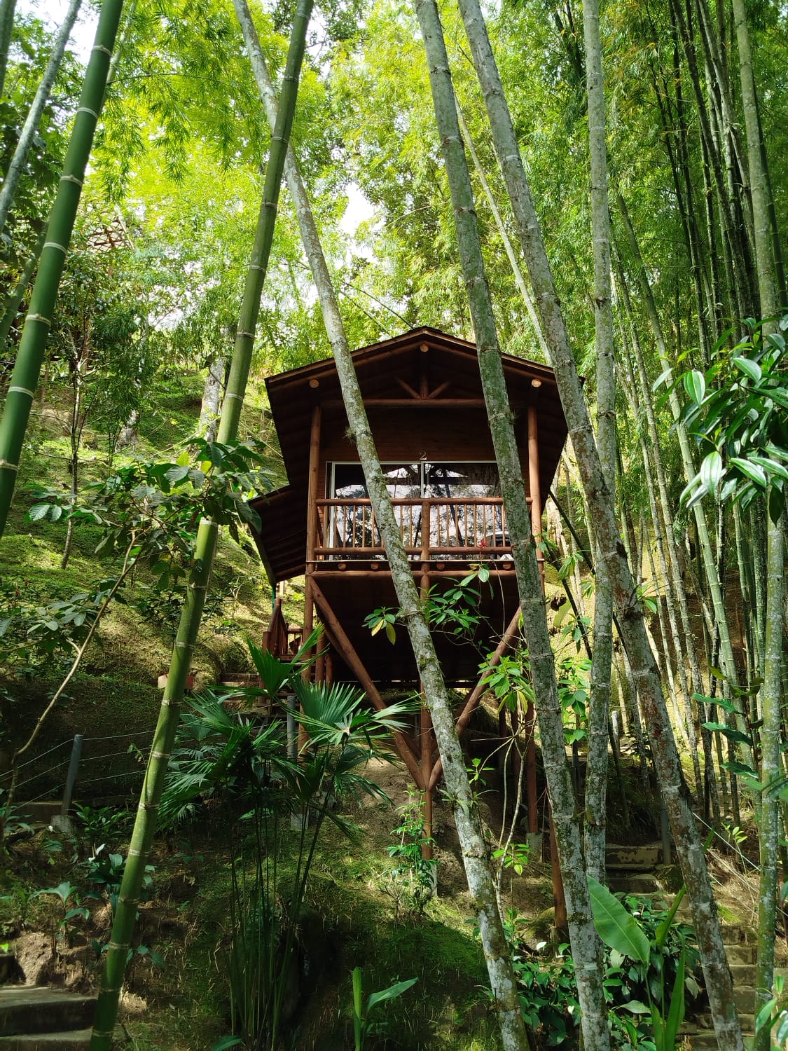 Cabaña elevada para parejas, ubicada entre el guadual y rodeada de naturaleza. Su diseño tipo casa en los árboles ofrece un ambiente acogedor y privado. Cuenta con cama doble, baño privado, televisor y un balcón ideal para disfrutar de la tranquilidad y la belleza del entorno natural.