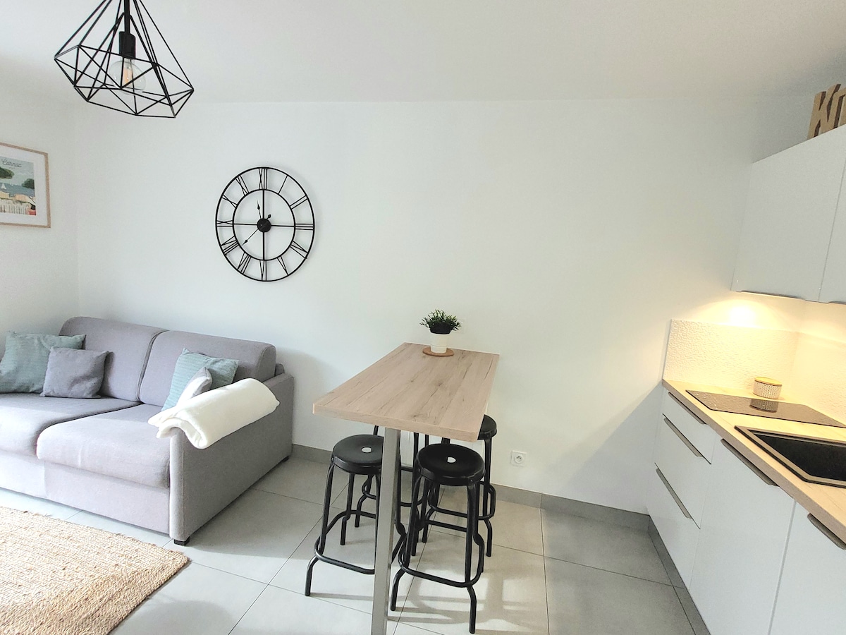 Natatanging accommodation na may tanawin ng daungan nito mula sa deck at interior, access sa port - mga tindahan na 5 minutong lakad at 10 minuto papunta sa unang beach. Ang apartment ay 35m2, kabilang dito ang: - Pasukan na may laundry closet - isang hiwalay na silid - tulugan na may isang kama ng 140*190 - banyo - isang Living Room/Living room/Kusina ng 20m2 - terrace kung saan matatanaw ang condominium park. Pinapayagan ang mga alagang hayop na napapailalim sa: pagsunod sa mga alituntunin at pag - check in na ibu - book. Walang dagdag na bayarin.