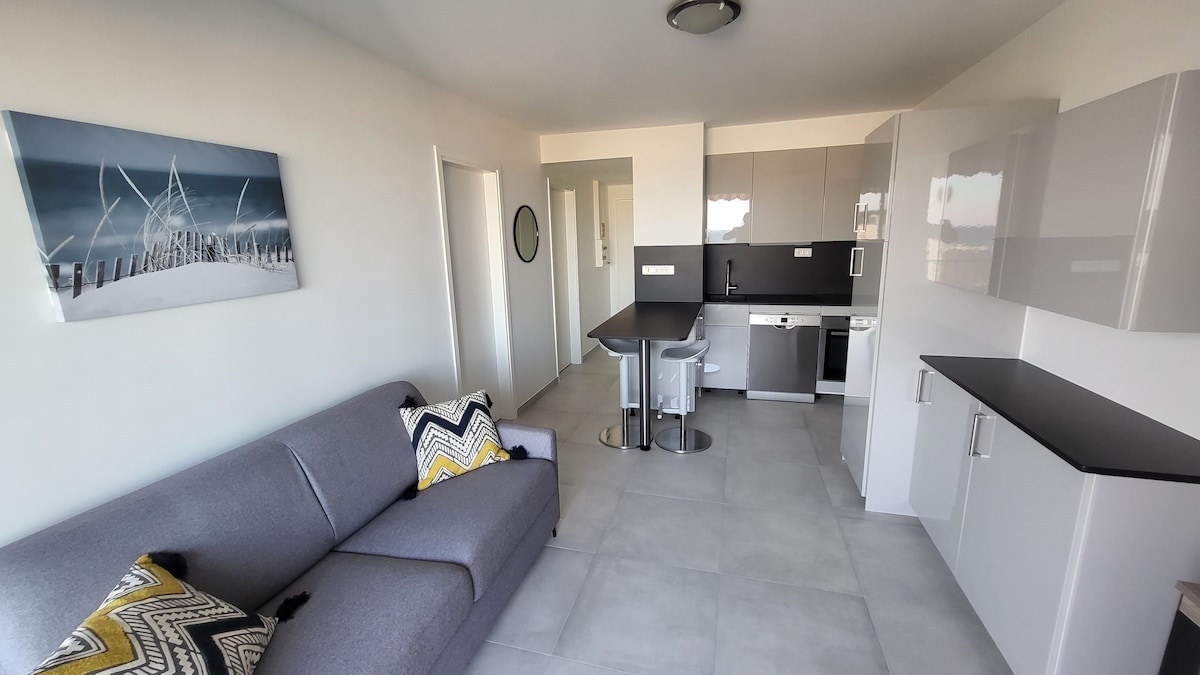 Sa pagitan ng daungan at beach, ganap na na - renovate na studio na may kagamitan para sa 2 tao, sa ika -7 at huling palapag ng isang tirahan na may 2 elevator Sala na may sofa bed, dahil na - install na ang mga kurtina ng blackout sa gabi (walang shutter) Nilagyan at nilagyan ang kusina: induction plate 2 sunog, refrigerator, Senseo coffee maker, microwave. Banyo na may toilet, shower, washing machine Kasama ang pribadong 🅿paradahan, na mahalaga para sa iyong katahimikan sa panahon ng tag - init Available ang karaniwang imbakan ng bisikleta