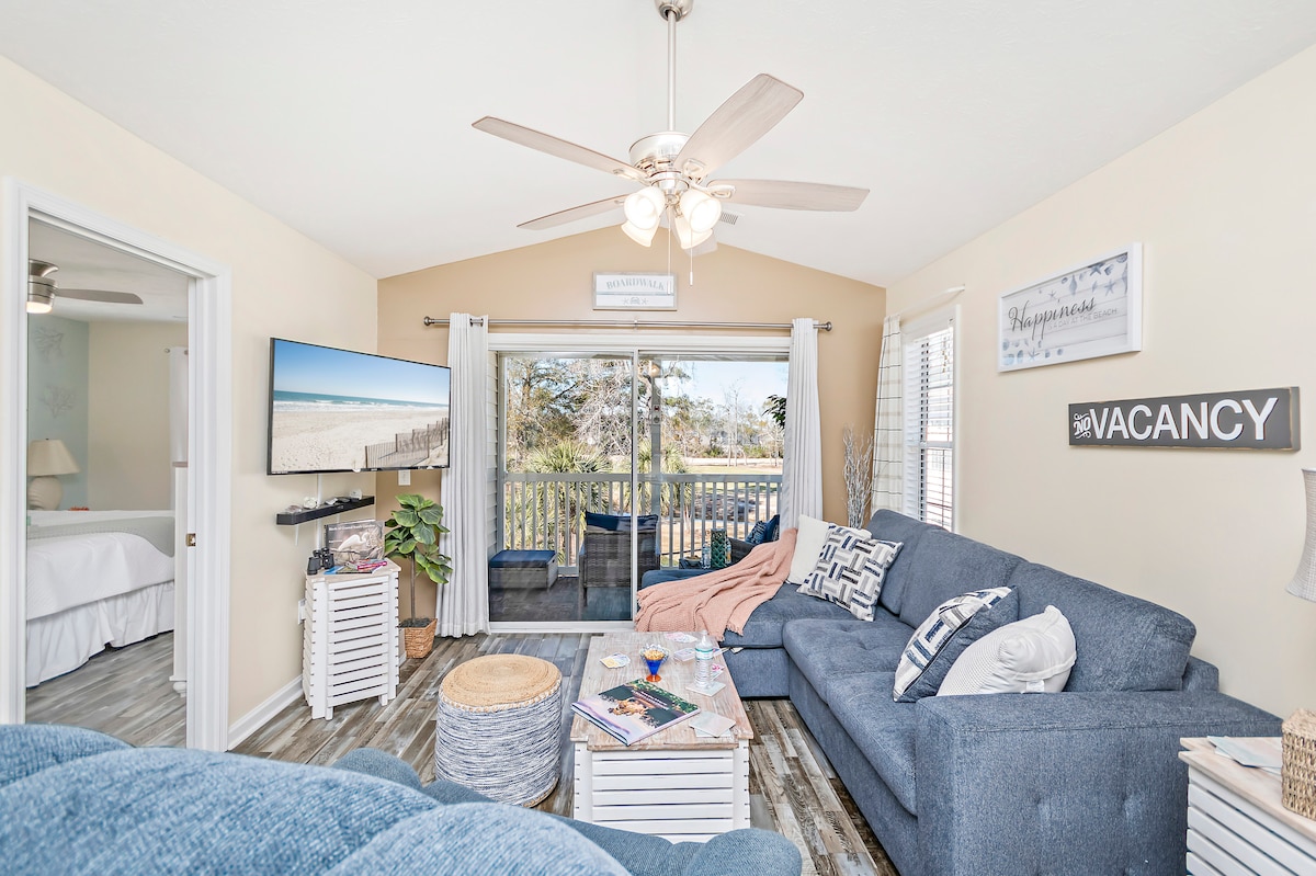 Magrelaks sa 2Br/2BA condo na ito na 2 milya lang ang layo mula sa beach! Masiyahan sa mga tanawin ng pool at golf course mula sa balkonahe. Nagtatampok ang master suite ng king bed at en - suite na paliguan, ang pangalawang silid - tulugan ay may komportableng kama, at ang sofa ng sala ay humihila para matulog nang dalawa pa. Mag - unwind gamit ang pribadong WiFi, cable TV, at kusinang may kumpletong kagamitan. Kasama sa mga karagdagan ang libreng paradahan, in - unit washer/dryer, at access sa elevator — lahat ng kailangan mo para sa perpektong pamamalagi. Magrelaks sa balkonahe na may mga upuan sa patyo at mga nakamamanghang tanawin ng golf sa tabi ng pool!