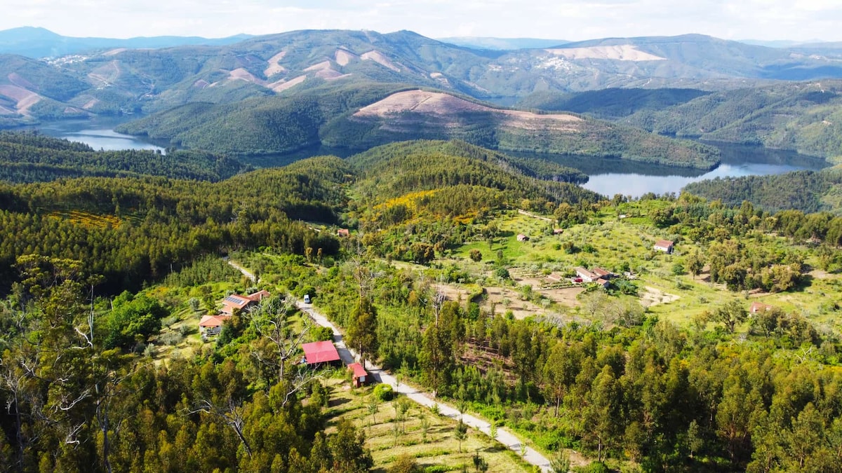 The house is located in the Mondego River Valley on walking distance of a beautifull isolated riverbeach. A great place to get away from the stressed world. Excellent for a couple or an individual who loves the simplicity, purity and silence of nature. The house includes an open kitchen and living room, a 11 m2 mezanine for sleeping, an outside shower, compost toilet in a 5000 m2 forest garden with granit boulders, natural structures, sculptures and chillout places.