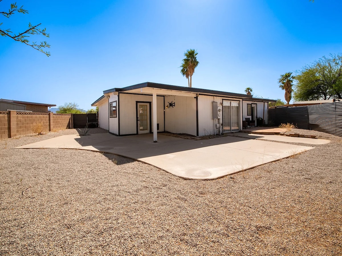 Angkop para sa pamilya (may pool na walang gate) na 411 sq ft na tuluyang estilo ng studio na may 2 bukas na lugar na matutulugan. Hanggang 4 ang makakatulog. King feather bed at isang pullout queen sleeper. Matatagpuan ito pagkalampas sa isang kaakit‑akit na hardin kung saan puwede kang makakita ng mga hummingbird. May pribadong paradahan at pasukan kaya puwedeng pumasok at umalis kaagad. IPARESERBA ang Isa Pa naming King Suite na nasa tabi mismo ng Casita! Puwede pang matulog ang 2 karagdagang bisita! Magpalamig sa pool, gamitin ang patyo sa labas (kung saan matatagpuan ang istasyon ng pagluluto, walang kusina sa casita). Min. mula sa I -10 & stellar Tucson Biking Loop!!
