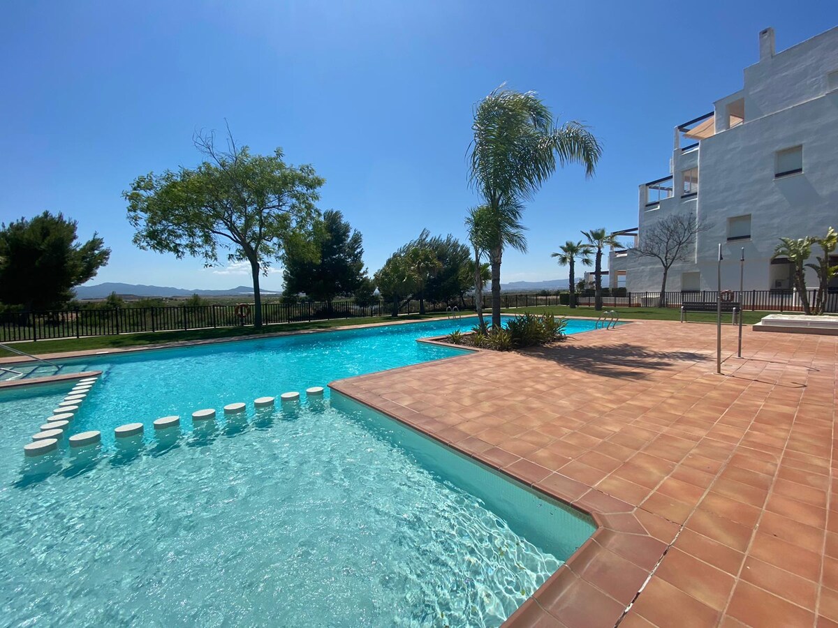 "Casa de Lemon" is a sunny apartment by the pool for up to four guests, offering modern comforts with a spacious sunroof terrace. It features two bedrooms (double & twin), a fully equipped kitchen, and a lounge area, all newly furnished. The terrace provides a BBQ, dining set, and loungers, with views of the pool and Sierra Espuña mountains. Entertainment options and pool/beach essentials are included. And Alhama Signature presents a formidable test for golfers at all skill levels.