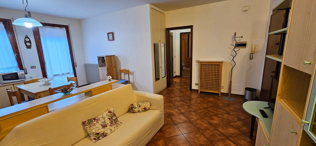 Magandang apartment na may air conditioning, washing machine at ilang espasyo sa labas. 100 metro mula sa hintuan ng bus at tindahan na nagbebenta ng sariwang prutas at gulay at pang - araw - araw na pamilihan. Kung interesado ka sa mga lokal na pagkain at alak, maaari ka naming bigyan ng payo tungkol sa mga kalapit na tindahan at bukid. Mas malaking supermarket na bukas nang 7/7 wala pang 10 minuto ang layo (habang naglalakad). 20 minutong lakad ang layo ng kastilyo ng bayan (sa Prosecco Hills). Malapit lang ang tinitirhan namin, nagsasalita kami ng Italian pero tinutulungan kami ng mga anak na tumanggap ng mga dayuhang bisita.