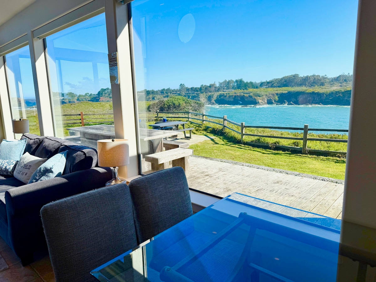 "Tingnan ang karagatan" mula sa bawat kuwarto sa tuluyang ito sa baybayin sa isang liblib na peninsula. Isang buhay na painting, pangarap ng mahilig sa karagatan ang bahay na ito. Makinig ng mga alon na bumabagsak sa baybayin, panoorin ang masiglang paglubog ng araw at paglipat ng mga balyena mula sa wrap - around deck o habang humihigop ng alak sa hot tub. Mainam para sa romantikong bakasyon o grupo ng mga kaibigan. Mga minuto mula sa downtown Mendocino at maraming parke at atraksyon ng estado - Isang perpektong kanlungan para sa pagtuklas sa North Coast.