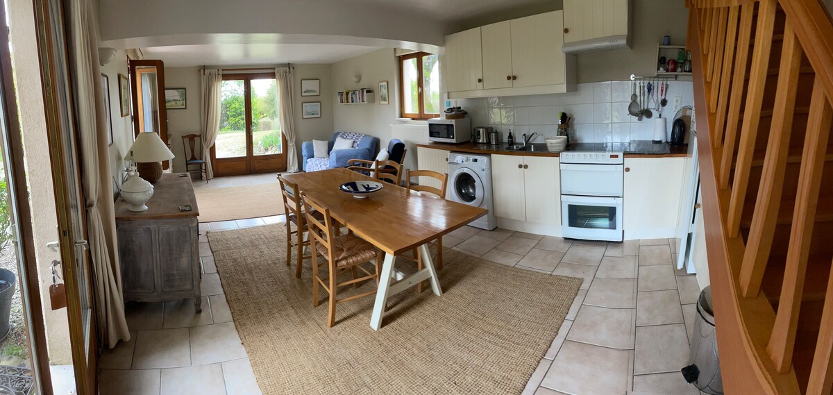 Mainam para sa dalawang may sapat na gulang at isang bata ang maluwang na gite na ito na may magagandang tanawin sa kanayunan. Binubuo ito ng sala na bukas sa kusina/silid - kainan. Komportableng nilagyan at nilagyan ang lahat. Sa itaas ng malaking silid - tulugan na may double bed, isang solong higaan pati na rin ang shower room at toilet. Nakatuon sa iyo ang isang lugar sa labas para makapagpahinga at kumain. Pool (16 x 6 m) para ibahagi sa mga bisita ng aming pangalawang cottage. Kami mismo ang nakatira sa property.