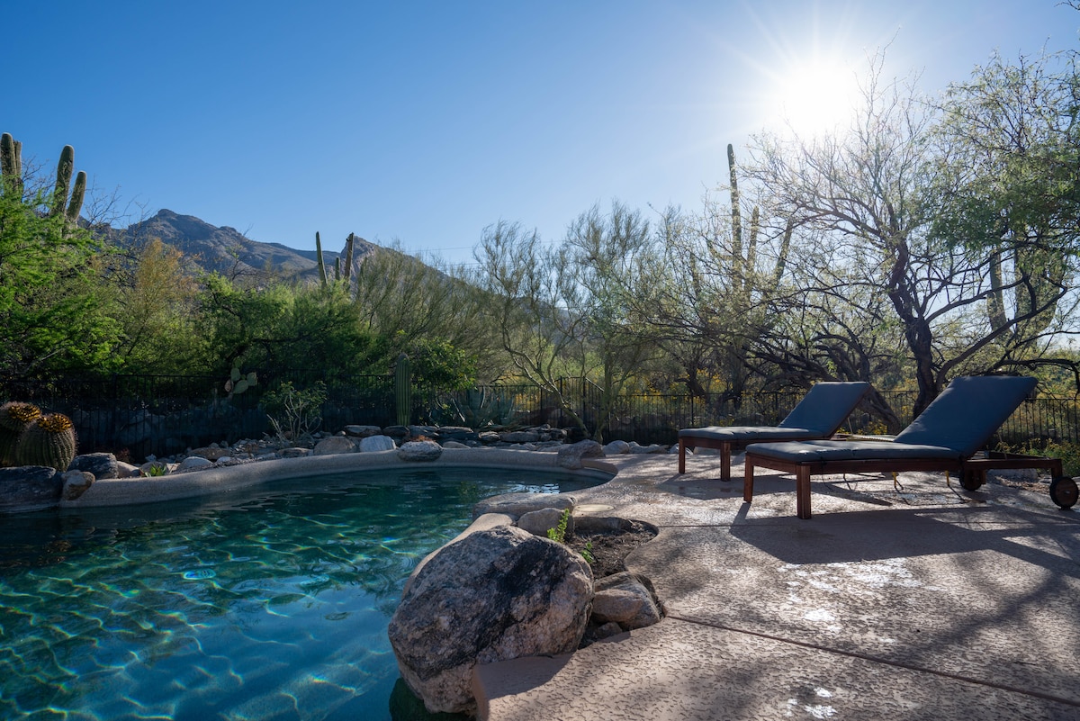 ** Kasama sa lahat ng tuluyan ang libreng pool at spa heating!** Maligayang pagdating sa Hacienda Riad: isang natatanging pagsasama ng disenyo ng Sonoran at Moroccan. 16 na minuto papunta sa University of Arizona 25 minuto papunta sa Downtown Tucson 27 -37 minuto papunta sa Saguaro National Park (West/East) Matatagpuan ang bahay sa tahimik na kapitbahayan sa paanan ng Catalina Mountains na napapalibutan ng katutubong tanawin ng disyerto. Ang tuluyan ay perpekto para sa pagrerelaks sa tabi ng pribadong pool at may maraming marangyang hawakan habang komportable, natatangi at kaswal.