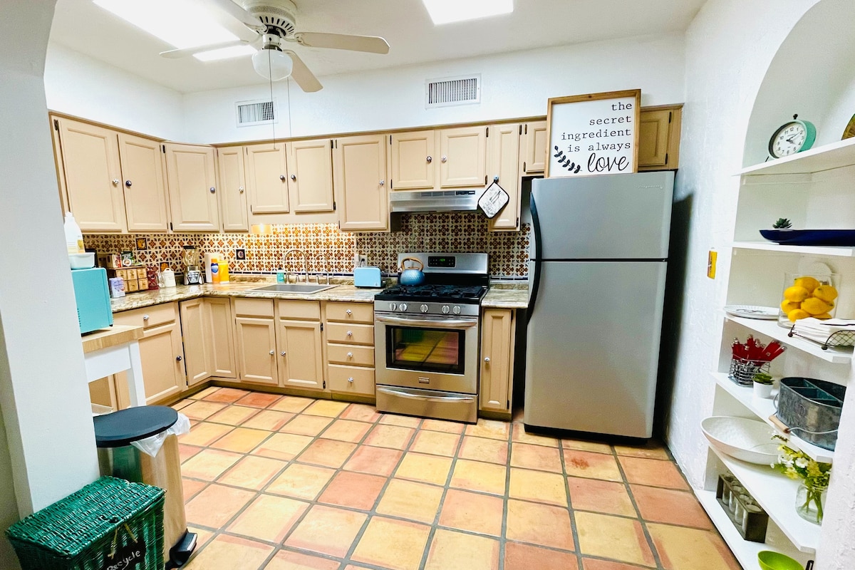 1937 adobe bungalow, na matatagpuan sa makasaysayang kapitbahayan ng Palo Verde, ilang minuto lamang ang layo mula sa UofA, downtown, Banner Medical Center, Tucson Botanical Gardens at ilang bloke mula sa The Arizona Inn. Ang makapal na pader ng adobe at mga double - pane na bintana ay ginagawang tahimik na bakasyunan. Masiyahan sa sakop na patyo, may sapat na gulang na tanawin ng disyerto - sa harap at likod - at pribadong shower sa labas. Pinagsasama ang kontemporaryong kaginhawa at vintage charm, kabilang ang mga high‑end na kasangkapan at kombinasyon ng kabinet, mesa, at murphy bed