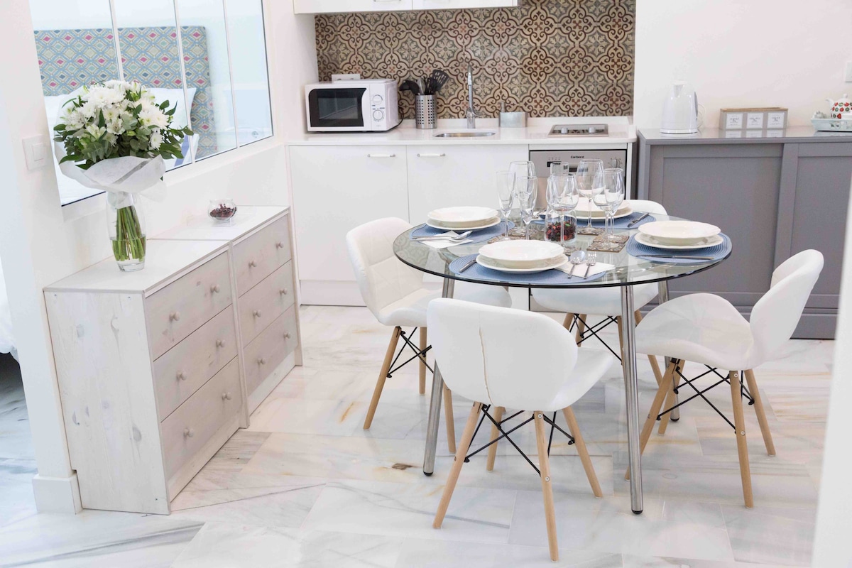 Studio reformado sa tabi ng ilog Guadalquivir. Split air conditioning (malamig/init), malaking terrace na may chill out area, bed "queen" visco (150x190), WiFi 600MB, Smart TV, teleworking area, kumpletong kagamitan sa kusina at banyo na may bathtub! Napakalinaw at tahimik (sa isang residensyal na komunidad), mahusay na nakipag - ugnayan (daanan ng metro/bus/bisikleta). 10 MINUTONG LAKAD lang ang layo mula sa makasaysayang sentro, sa pinakasikat na kapitbahayan ng Seville, na may malawak na hanay ng mga tindahan at restawran. Lisensya: VUT/SE/06907