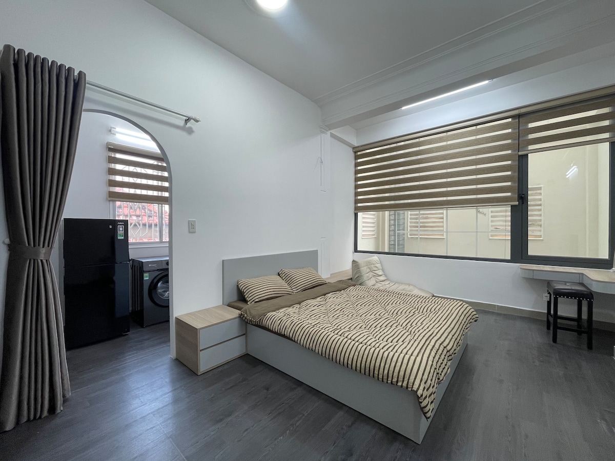 Isang magandang idinisenyong studio apartment na may lahat ng kailangan mo, na may gitnang kinalalagyan ngunit sapat lang ang layo para sa isang mapayapang gabi ng pagtulog na malayo sa mabigat na ingay ng lungsod. Mainam para sa mga biyaherong gustong mag - explore sa Saigon at naghahanap ng de - kalidad na kaginhawaan at mas lokal na karanasan. - Magandang swimming pool - Libreng mabilis na wifi, Cable TV - Mga libreng amenidad para sa iyong pamumuhay: washer, dryer, AC, refrigerator, mainit na tubig - Kusina na may sapat na mga tool para sa iyong pagluluto. Tandaan: Hindi nagbibigay/nagbibigay ng mga invoice ng VAT