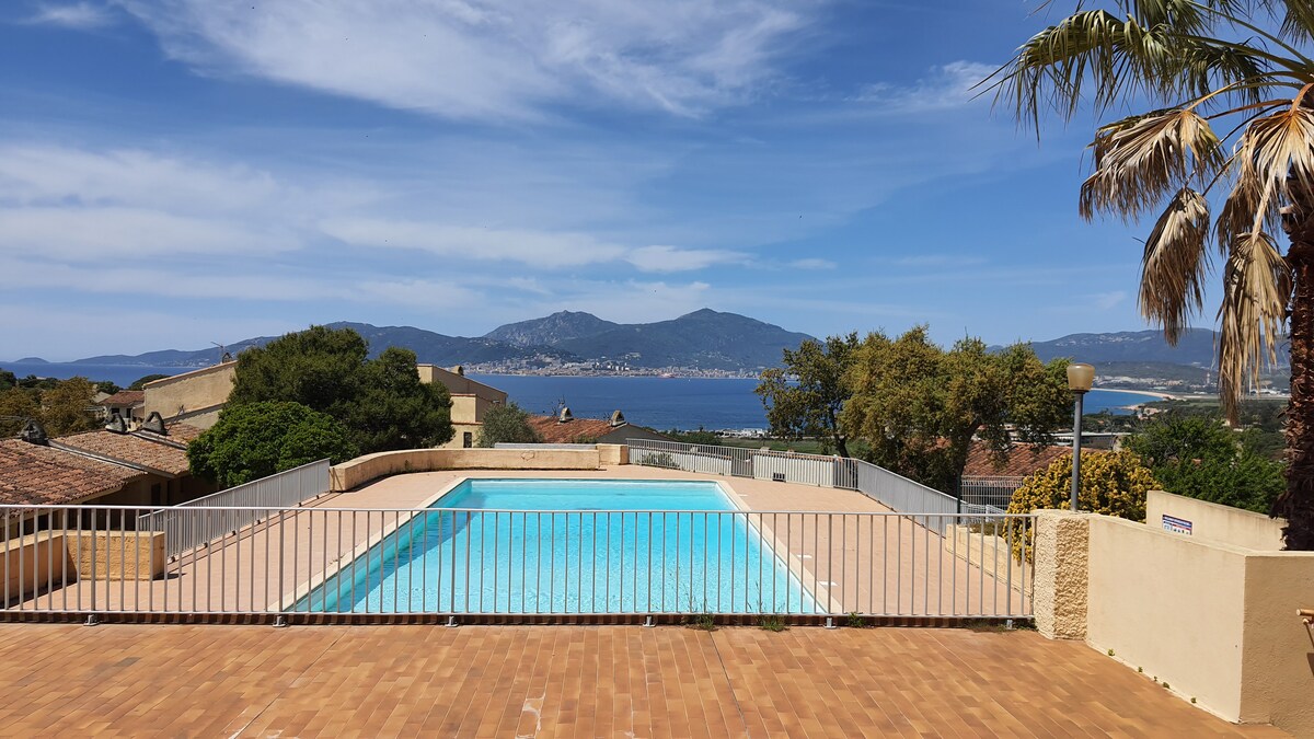 Kumpleto ang kagamitan sa apartment, 32m2 na may Balcony - Terrace na 7m2 na nag - aalok ng magagandang tanawin ng dagat at mga bundok. Sa pribadong tirahan na may swimming pool at paradahan. Malapit sa lahat ng amenidad, 5 minutong biyahe o 15 minutong lakad papunta sa beach, mga tindahan at restawran. Maraming mga punto ng atraksyon: mga isports sa tubig, mga ekskursiyon, mga hike, pagsakay sa kabayo, mga lugar ng turista at mga likas na kababalaghan. May perpektong lokasyon sa South Shore ng Ajaccio, para matuklasan ang Island of Beauty mula North hanggang South.