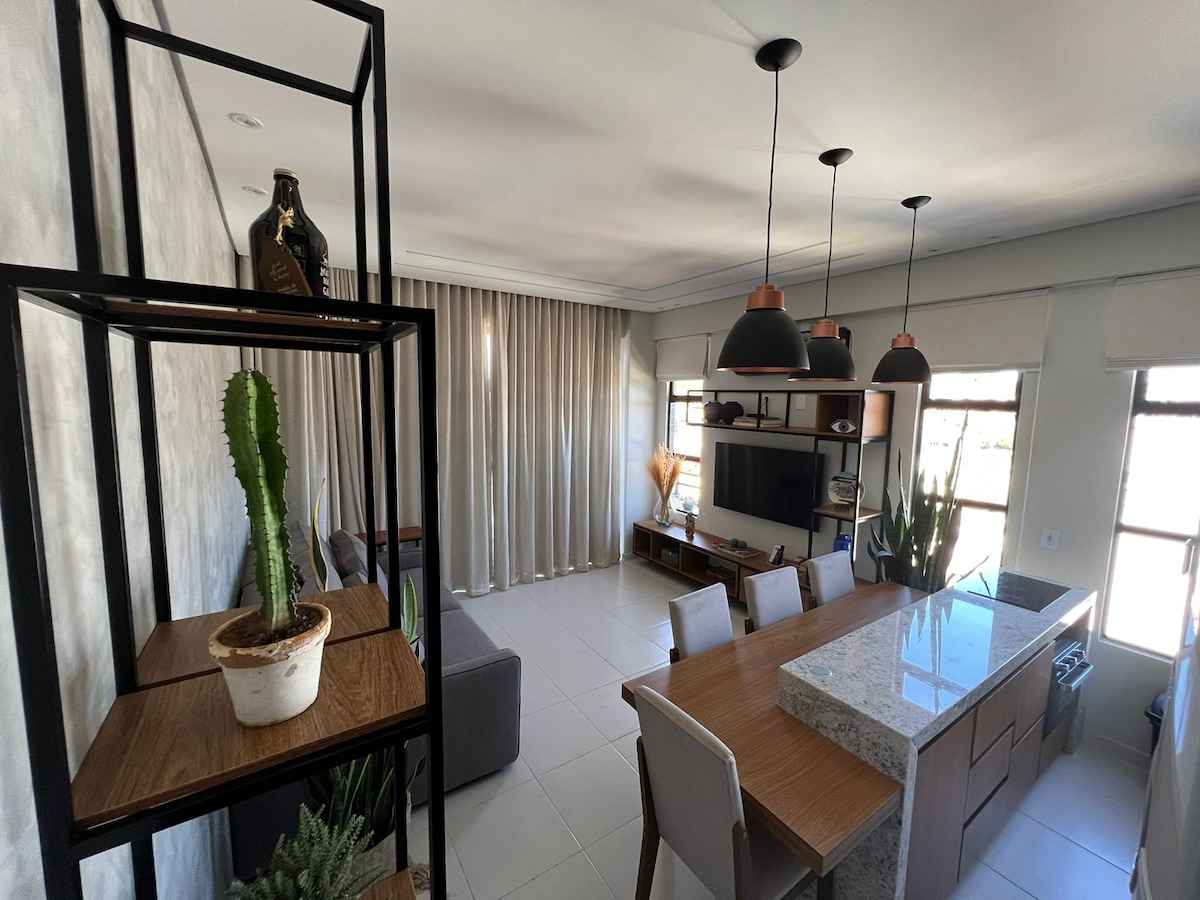 Matatagpuan may 5 minutong maigsing distansya mula sa Parque das Águas, ang flat ay may pinong dekorasyon at nag - aalok ng mga bed and bath linen, Wi - Fi, covered parking space,air - conditioning,hairdryer,TV at blackout curtains. Nilagyan ang kusina ng minibar, electric oven, microwave oven, electric stove na may bibig,coffee maker,set ng babasagin,kubyertos at iba pa. Sa common area ay ang laundry room at terrace na may barbecue,mga mesa at upuan na may malalawak na tanawin ng lungsod.