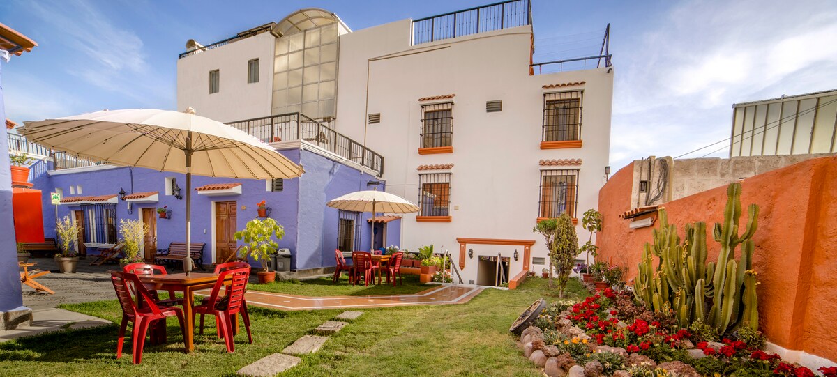 May mga bloke lang ang bahay mula sa Mirador de Yanahuara, na may malaking hardin at mga terrace. Malapit sa sentro ng lungsod at malapit sa Mall Aventura Cayma at Real Plaza sa Ejercito avenue. Ligtas na kapitbahayan sa isa sa mga pinaka - eksklusibong zone sa lungsod. Ang kuwarto ay independiyente at komportable, hiwalay na pribadong banyo para sa iyong kaginhawaan. Tamang - tama para sa mga turista at business traveler. Puwede mong gamitin ang iba pang bahagi ng bahay tulad ng kusina, sala, hardin, atbp. Kasama sa presyo ang pang - araw - araw na almusal.