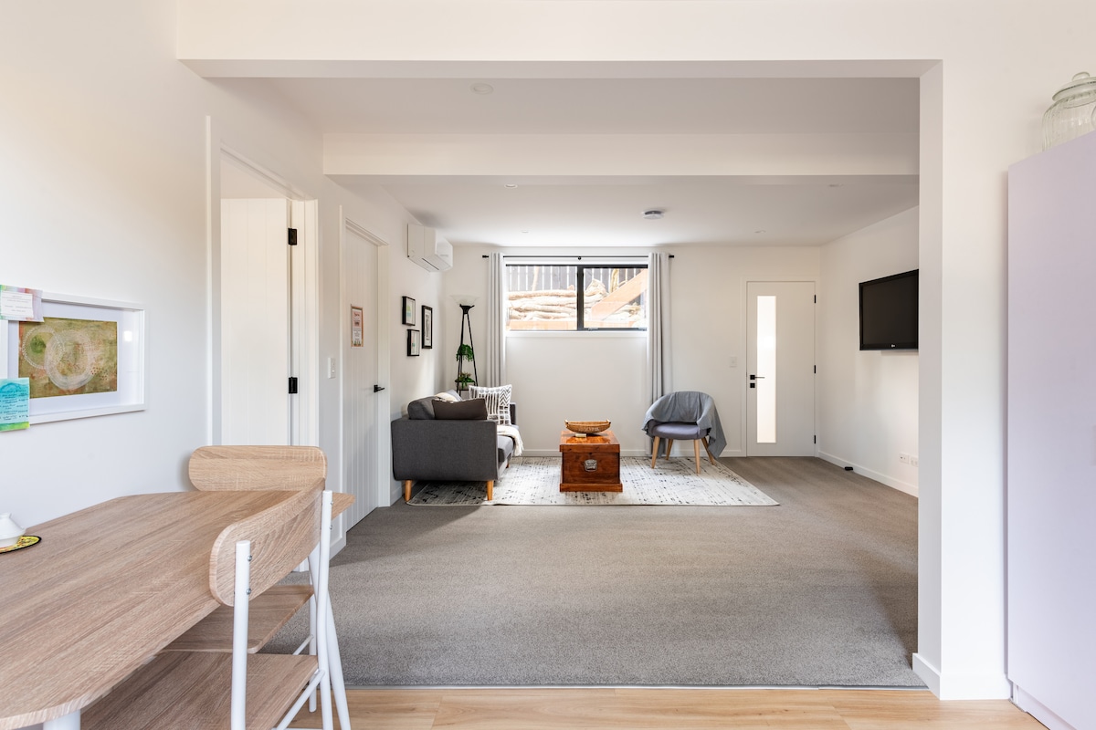 Maligayang pagdating sa Airbnb na mainam para sa mga alagang hayop. Nasa likod ng aming bahay ang apartment, na pinaghihiwalay ng aming dobleng garahe. Mayroon kang sariling silid - tulugan, sala, maliit na kusina, banyo, carpark at hardin sa likuran. Tandaang walang oven sa maliit na kusina. May microwave at de - kuryenteng frypan. Sentral na lokasyon, maglakad papunta sa supermarket, mga tindahan at kainan. May kasamang walang limitasyong Wi - Fi, Freeview, Chromecast, at continental breakfast. 15 minutong biyahe lang papunta sa Dunedin city o airport.