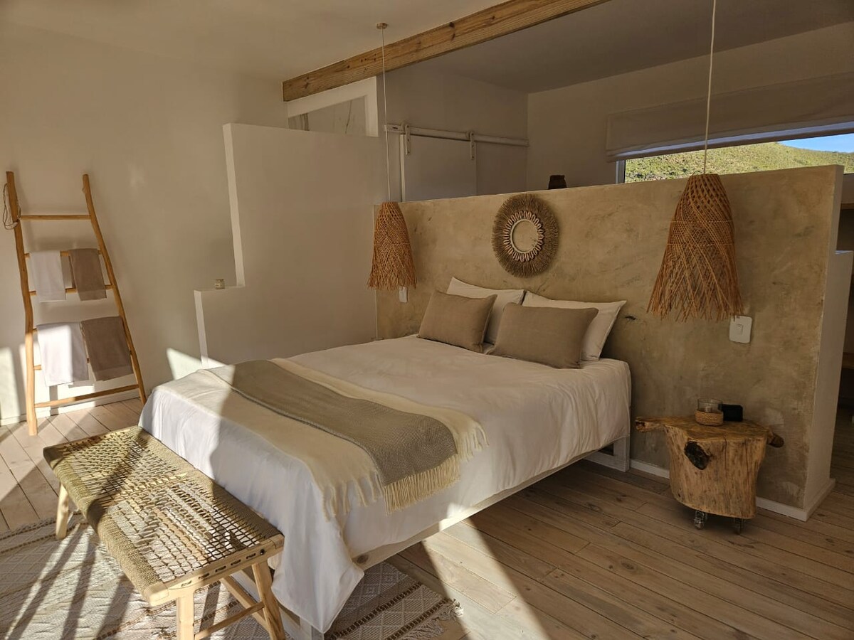 Nag‑aalok ang pribadong open‑plan na self‑catering na farm cottage na ito ng dating ganda na may sopistikado at minimalist na disenyo. Idinisenyo para sa pamumuhay na may kamalayan sa kapaligiran, tumatakbo ito sa kaunting kuryente at nagtatampok ito ng refrigerator - freezer, water cooler, gas stove, at gas geyser. Bagama 't walang TV, WiFi, o malakas na saklaw ng network, ito ang perpektong lugar para magpahinga at magdiskonekta. Sa pamamagitan ng marangyang linen at mga komportableng detalye sa iba 't ibang panig ng mundo, nag - aalok ang cottage ng mapayapa at komportableng bakasyunan - ang iyong perpektong tuluyan na malayo sa tahanan sa bukid.
