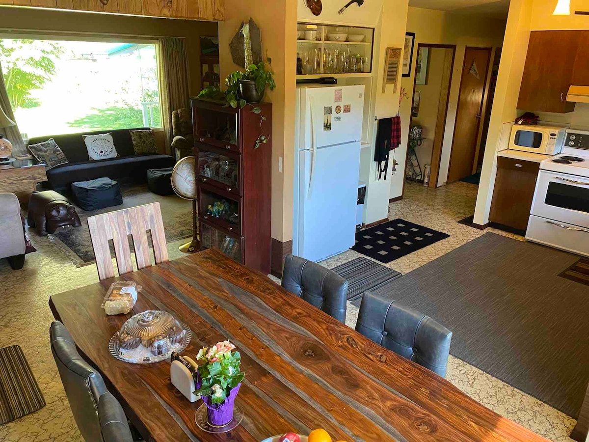 Inayos kamakailan ang buong 2 silid - tulugan na tuluyan, na may malaking bakuran at sapat na paradahan. Matutulog 4. Tahimik na lugar ng pamilya na may malaking bakuran at hardin. Kuwarto para sa paradahan ng RV at bangka. Mga puno ng prutas at gulay sa hardin na magagamit ng mga bisita sa panahon. Malaking patyo na may barbeque na available sa tag - init. Sentral na lokasyon na malapit sa pangunahing highway at sa ruta ng lokal na pagbibiyahe. Malapit lang ang hiking, skiing, at golfing, pati na rin ang maraming lawa at makasaysayang atraksyon.