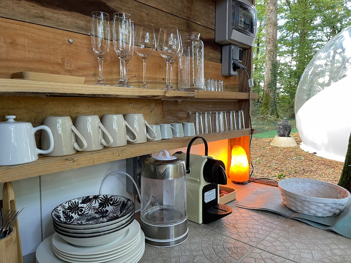 Sa isang nakapaloob at kahoy na parke, isang komportableng pugad para sa dalawa (gawa sa higaan). Maginhawang geodesic mini dome para mangarap ang mga mahilig sa paghahanap ng mga hindi pangkaraniwang gabi. May lapad na 2m35 at nilagyan ng pagbubukas ng kristal na PVC para obserbahan ang kalikasan at mga bituin, mayroon itong 140x190 na higaan para sa dalawa, storage space, at luggage compartment. Access sa pool. Lugar ng shower, mga pasilidad sa kalinisan, pagkain at pinaghahatiang bloke sa kusina sa ilalim ng bahay. Libreng paradahan sa parke