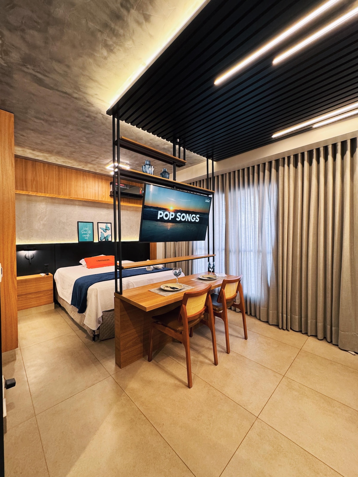 Ang arkitektura ng Flat ay nilagdaan ng isa sa mga pinakakilalang propesyonal sa Goiânia. Ang ideya ay para maramdaman mong nasa bahay ka lang sa panahon ng pamamalagi mo. Lahat ay awtomatiko; mga ilaw, kurtina, TV, Air Conditioning na nag - aalok ng amenidad at pagpipino, tanungin lamang si Alexa. Makinig sa musika, panoorin ang higit sa 1,600 channel na bukas at sarado. Kumuha ng magandang shower na may masaganang shower. Kumuha ng mga litrato at magpahinga sa balkonahe na may nakakamanghang tanawin ng paglubog ng araw at acrylic ceiling.