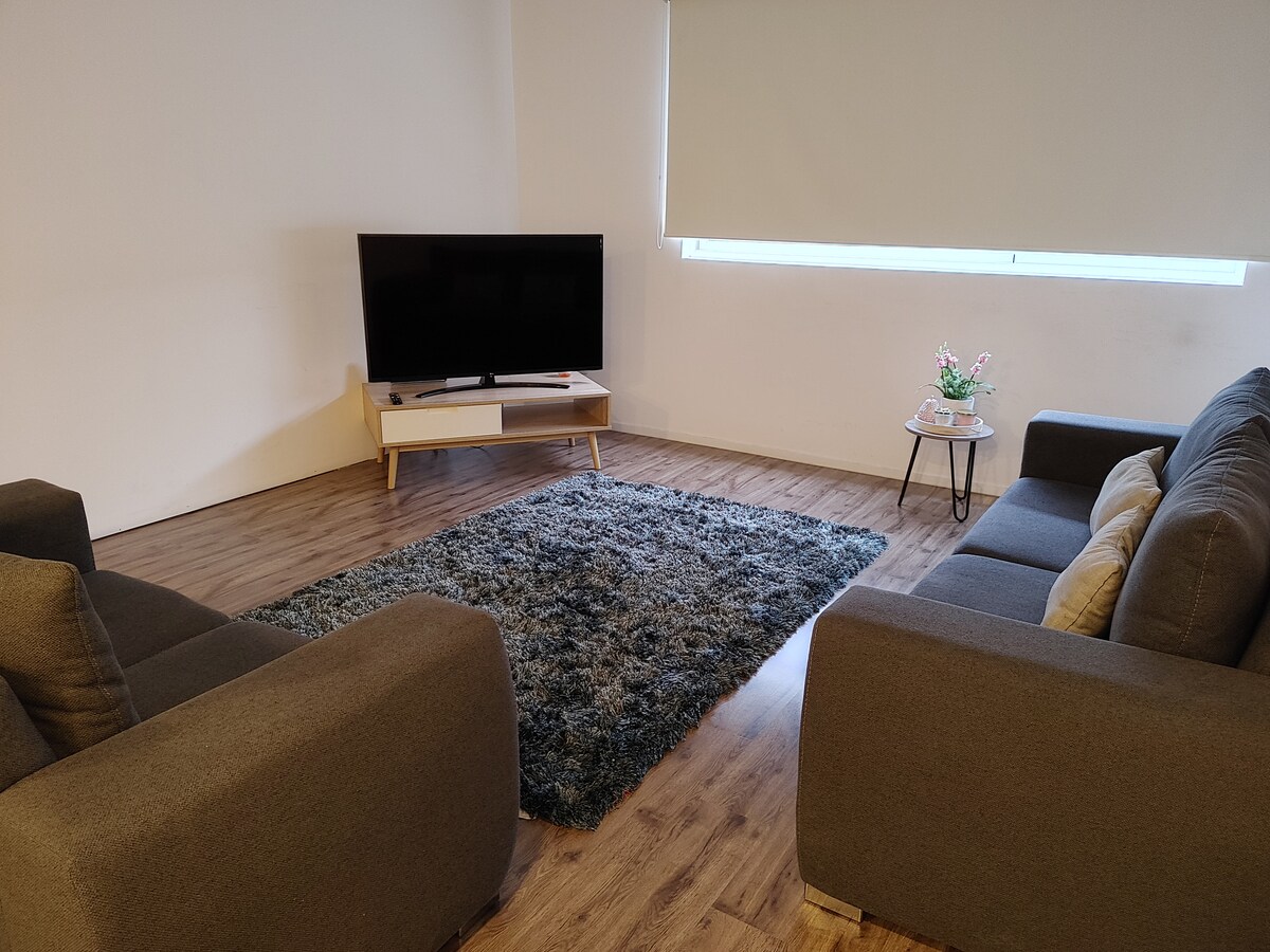 Masiyahan sa iyong pagbisita sa Queretaro sa isang super furnished apartment at napaka - komportable para sa malalaking lugar nito. Sala, silid - kainan. 2 silid - tulugan. 1 KS bed, 1 Mat bed at 1 Mat sofa bed. Mga tagahanga. Kumpletong kusina. 2 kumpletong banyo. WiFi. Cable TV. BT Soundbar sa Sala. Alexa. Dishwasher. Balkonahe w/ mesa at upuan para sa 2. Paradahan ng 2 kotse. Pagsubaybay ng 24 na oras sa saradong condominium. Smart electronic lock. Plaza Antea at Uptown (8min. 15 minuto mula sa lugar ng downtown. 25 minuto mula sa airport.