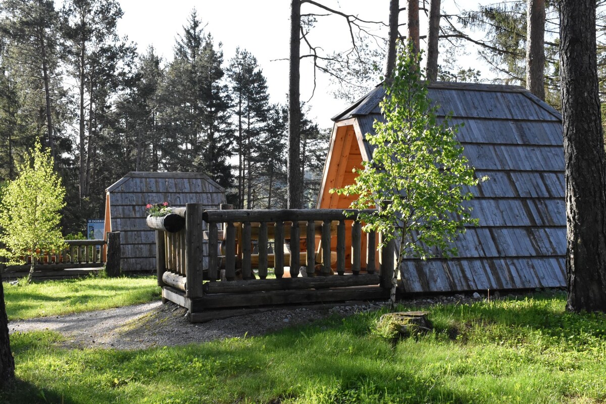 Bahay sa tabi ng mga lalaki sa kagubatan. Kung saan ang lawa ay nakakatugon sa kagubatan. Sinusunod namin ang pinakabagong trend sa camping na tinatawag na glamping, na isang espesyal na karanasan. Ang mga kahoy na bahay ay nagbibigay - daan sa iyo na matulog sa pakikipag - ugnay sa kalikasan ngunit sa isang mas komportableng paraan. Ang mga bahay ay para sa mga magdamag na pamamalagi at iba 't ibang mga panlabas na aktibidad sa pamamagitan ng prinsipyo: malusog, natural at komportable. Maaari kang magrenta ng mga bahay o lugar sa labas para sa iba 't ibang aktibidad para sa mga indibidwal o grupo (pagdiriwang, anibersaryo, workshop, atbp.)